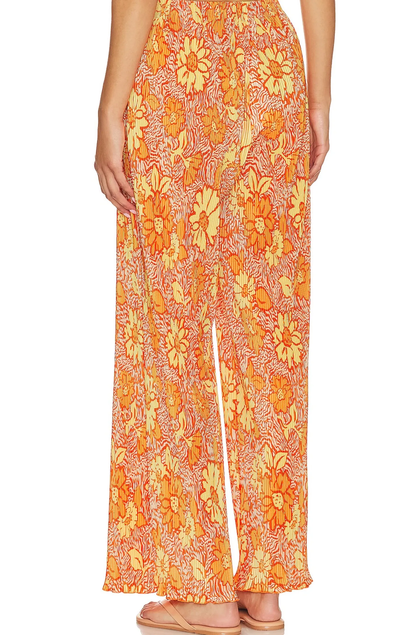 95% polyester 5% spandex.Made in China.Dry clean only.Pull-on styling with elastic waistband.Midweight plissé fabric with lettuce hem.Item not sold as set.26" at the knee and 26" at the leg opening