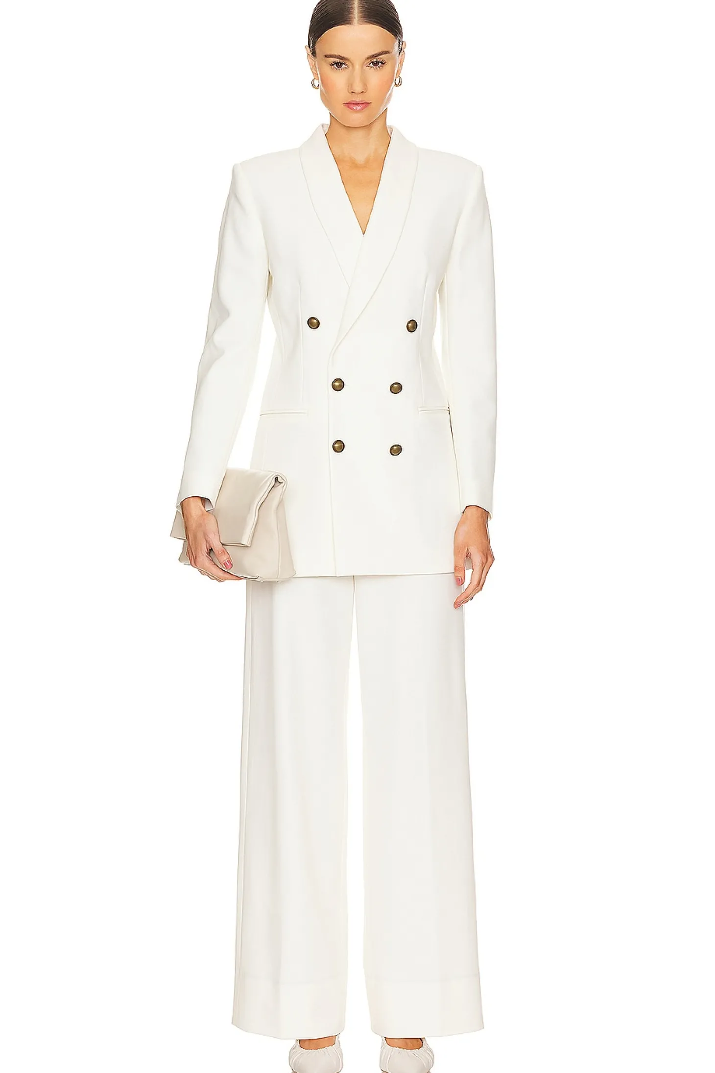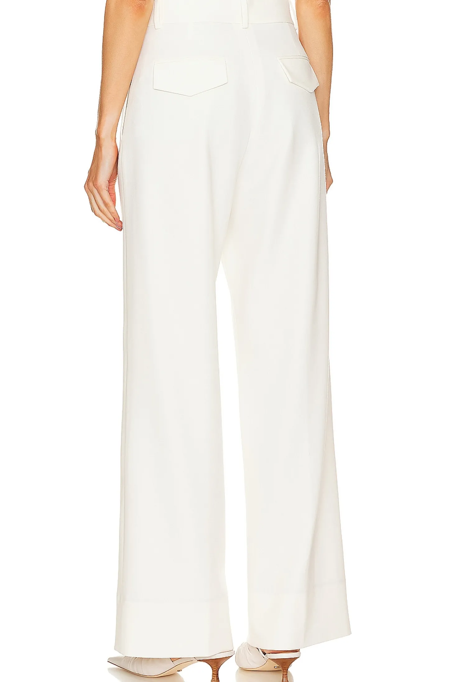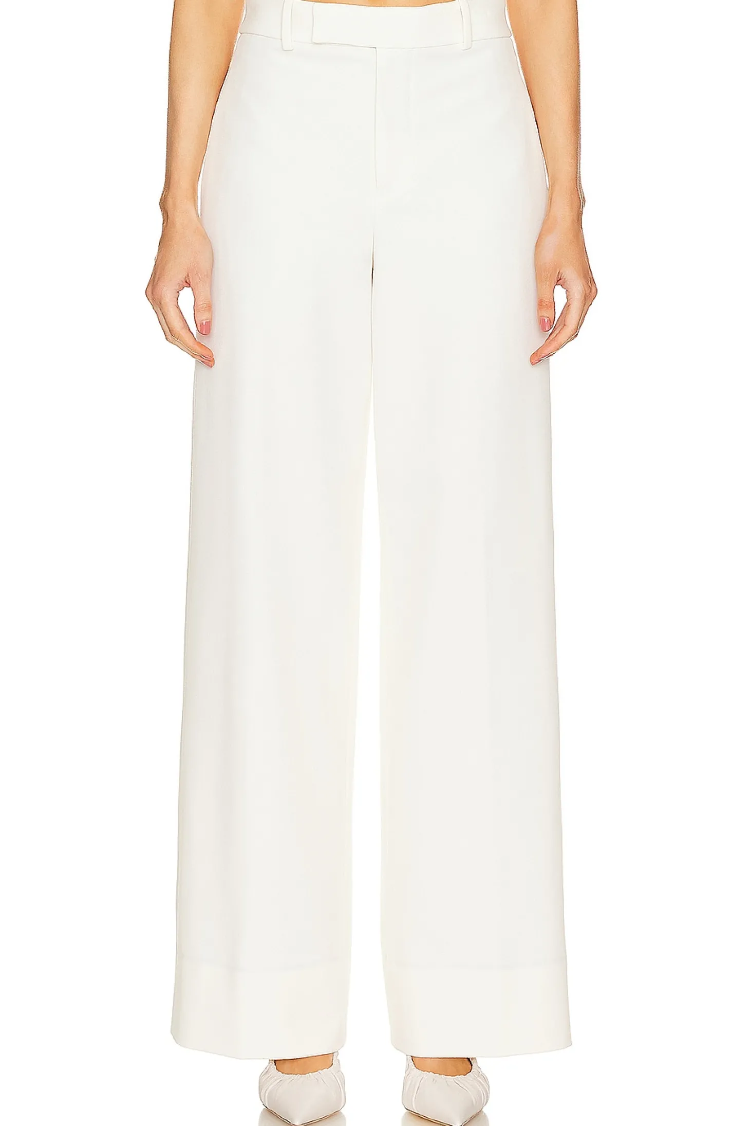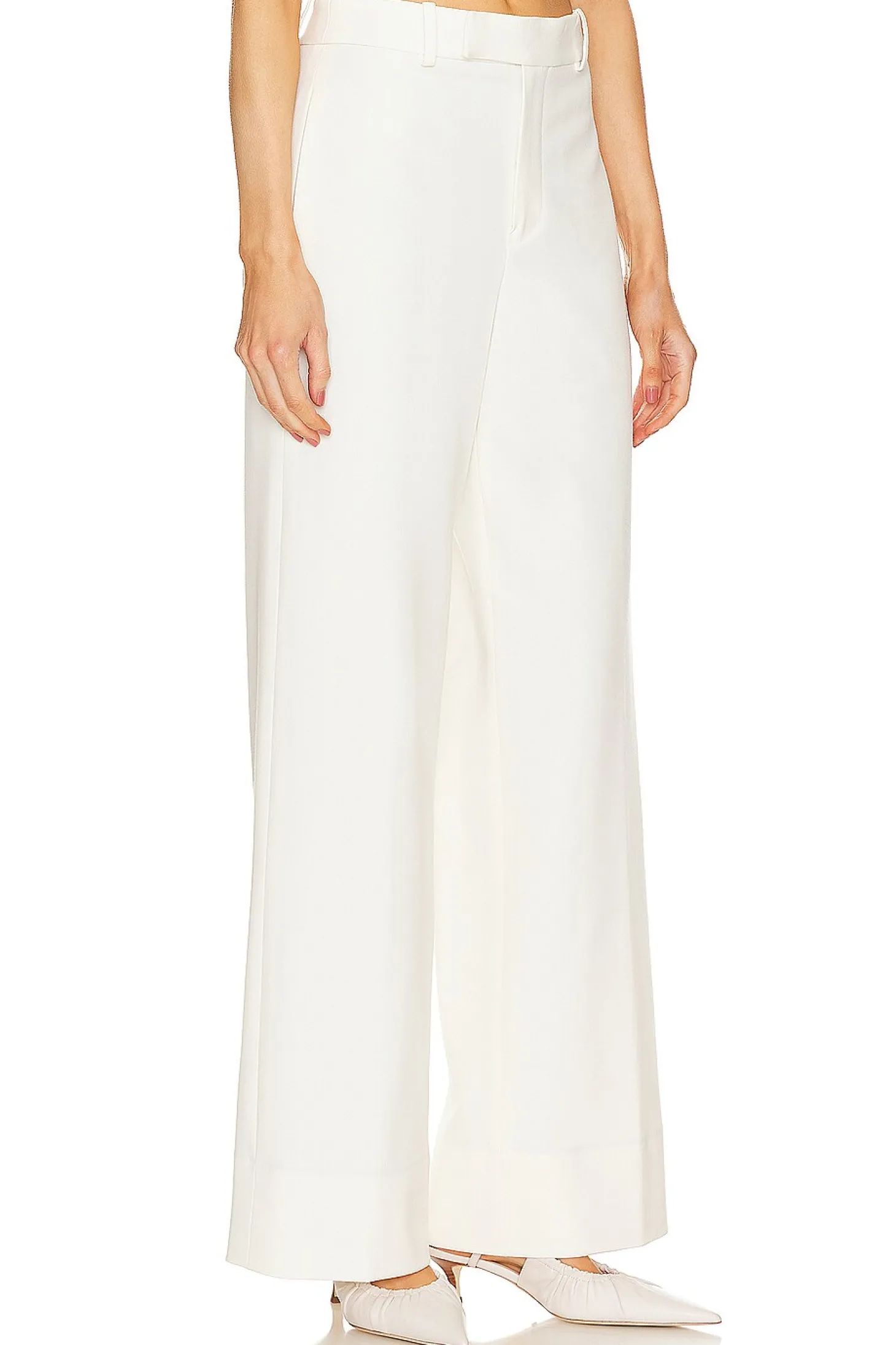 Self: 68% polyester 29% viscose 3% elastane Lining: 100% viscose.Made in Portugal.Dry clean only.Zip fly with hook and bar closure.4-pocket styling.Crepe suiting fabric.23" at the knee narrows to 22.5" at the leg opening