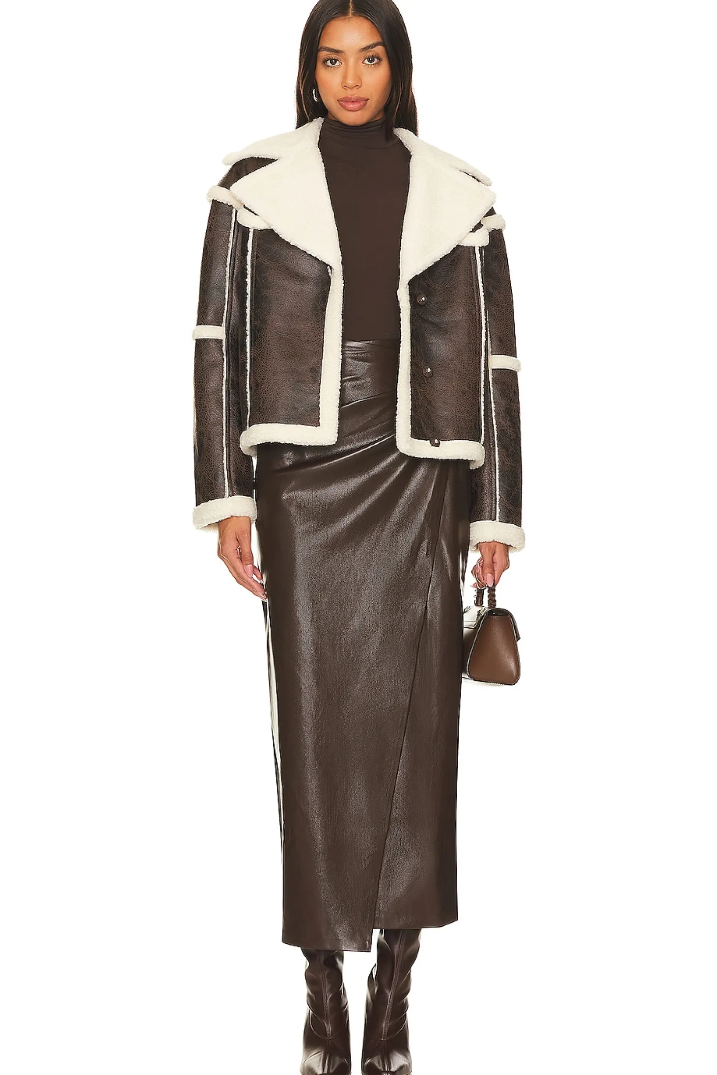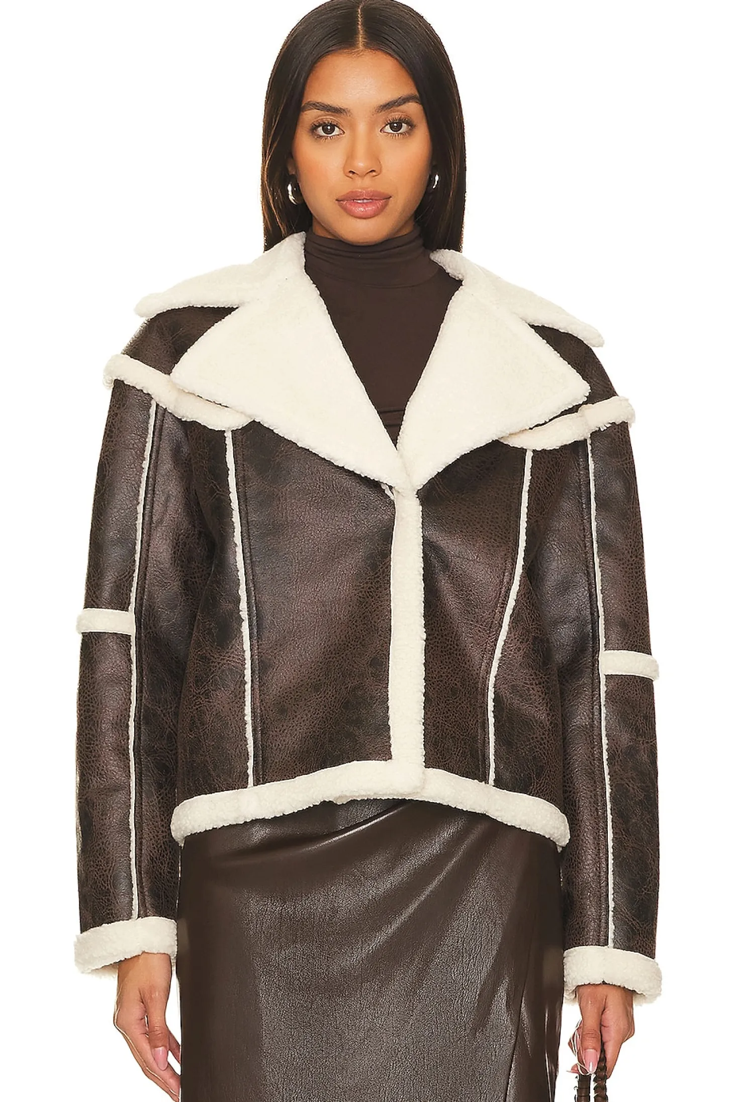 100% polyester.Made in China.Dry clean only.Front snap button closure.Side seam pockets.Distressed faux leather fabric with shearling trim