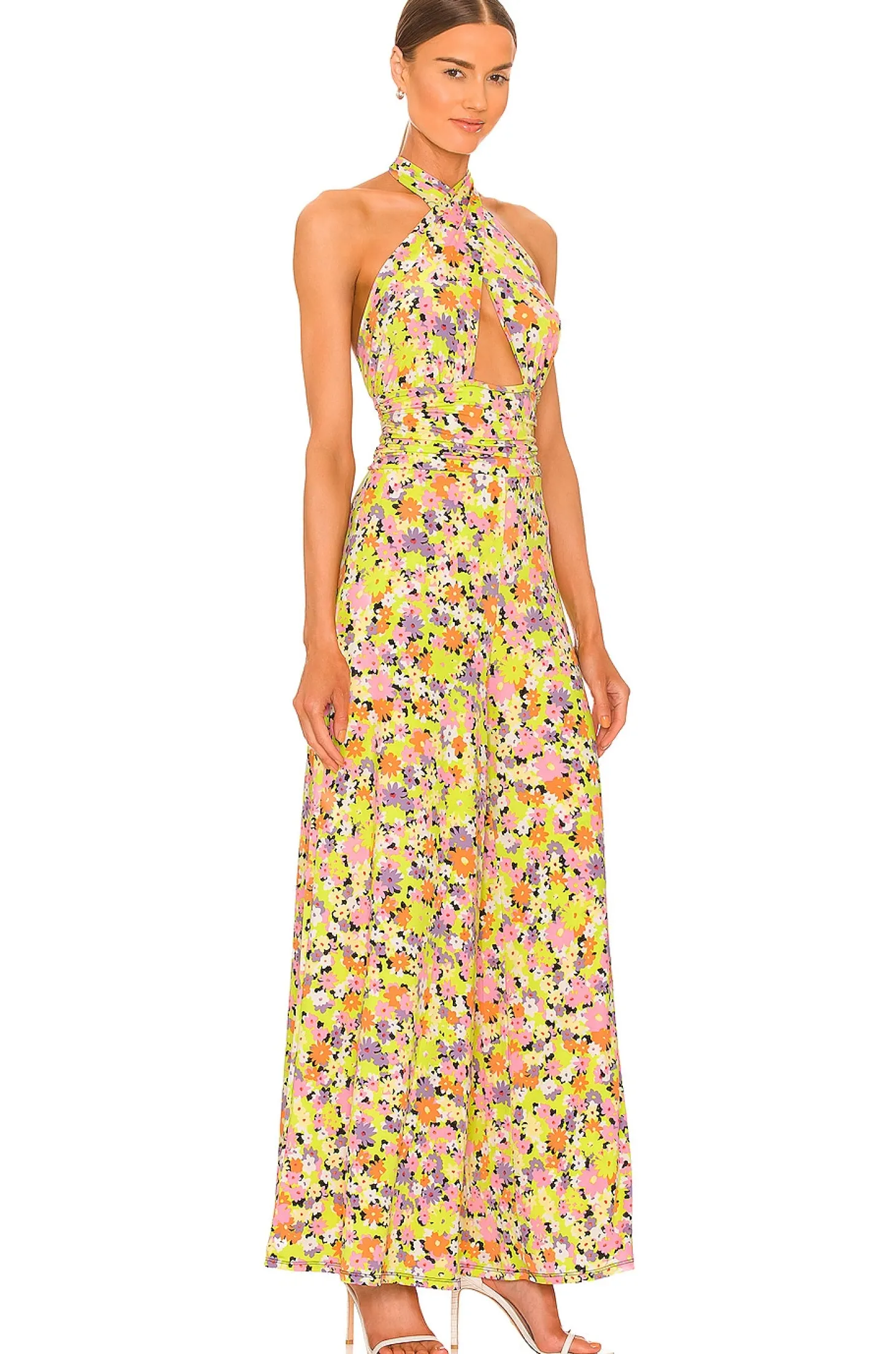96% poly 4% spandex.Made in China.Machine wash.Crisscross halterneck tie closure.Bust cut-out.Jersey fabric