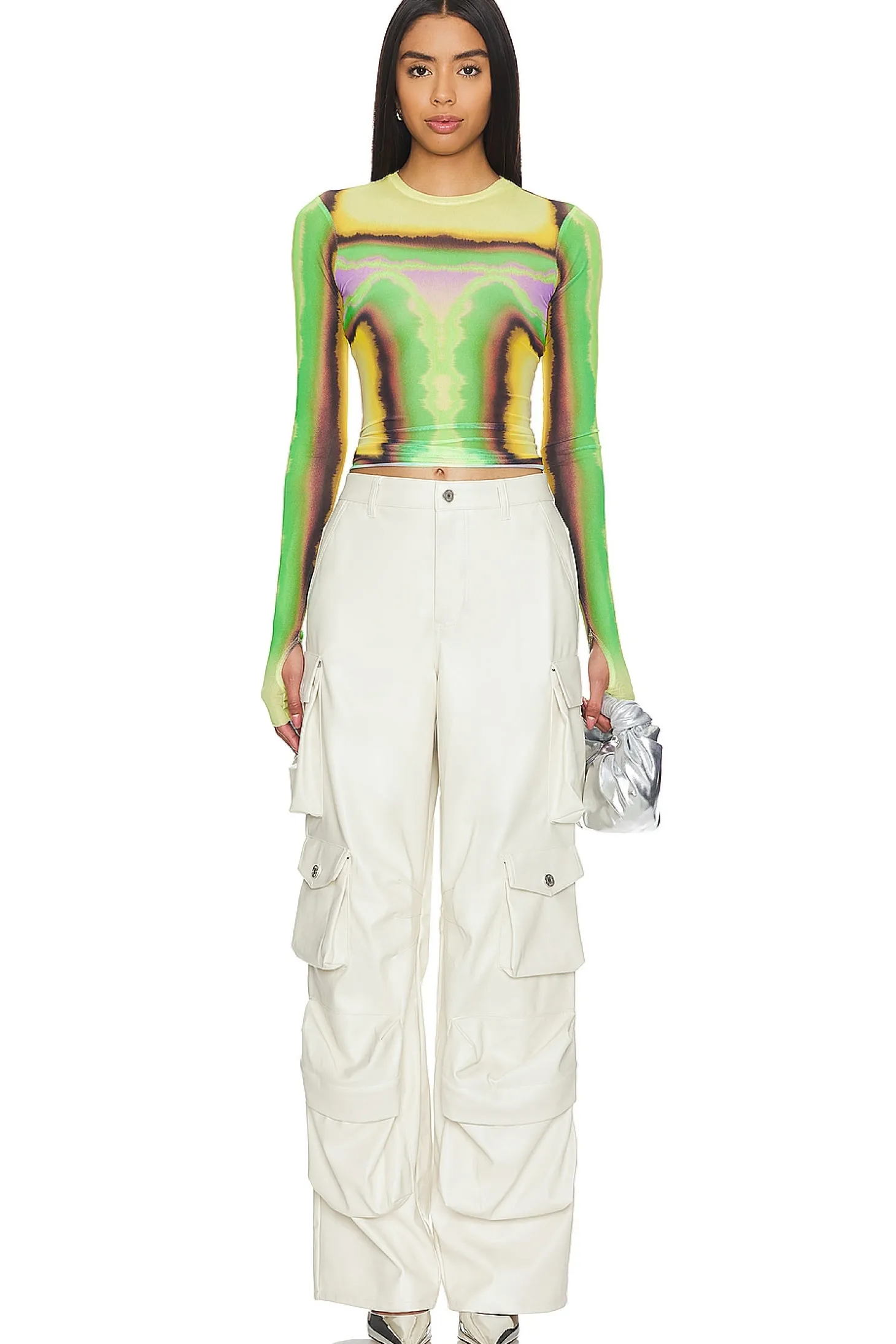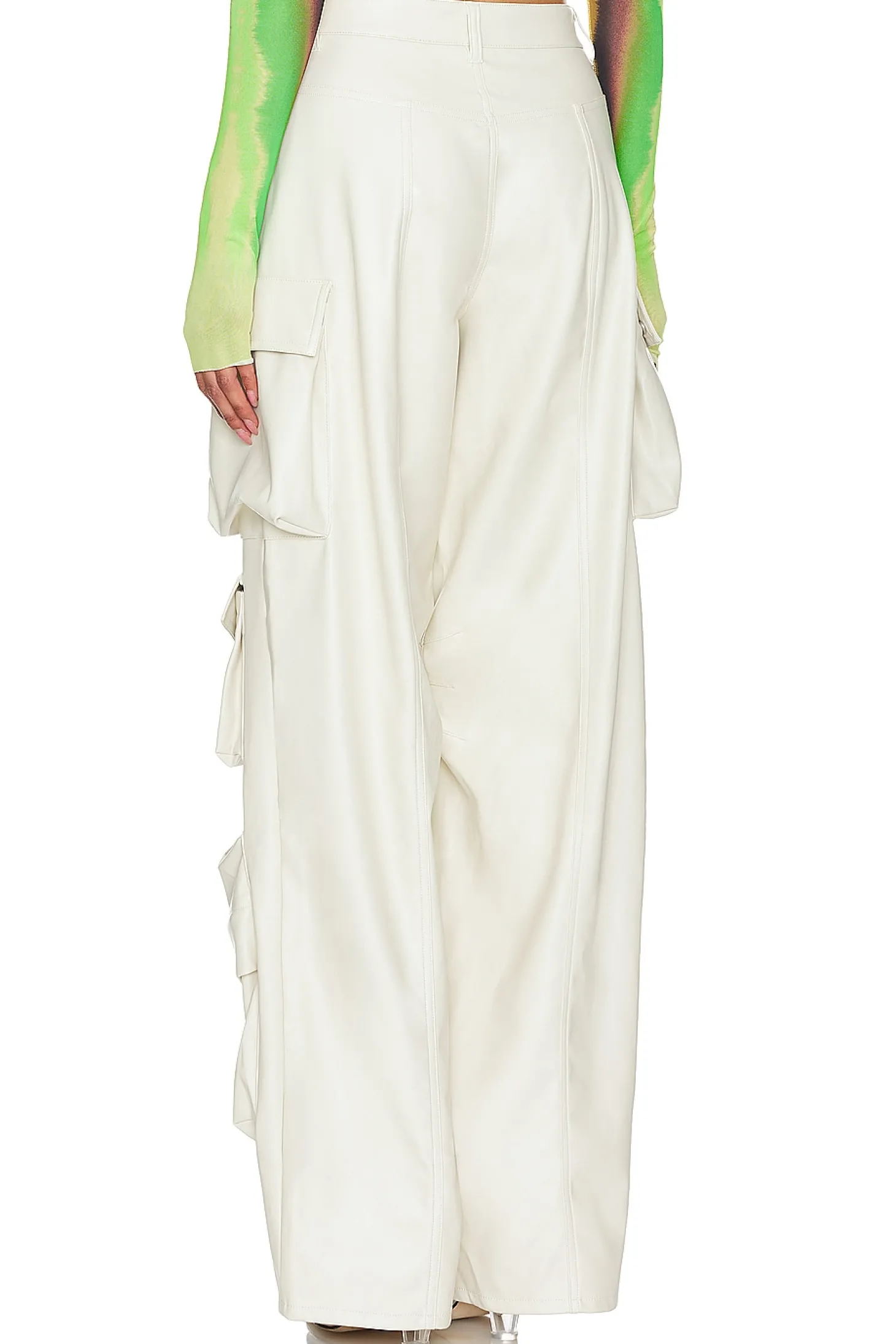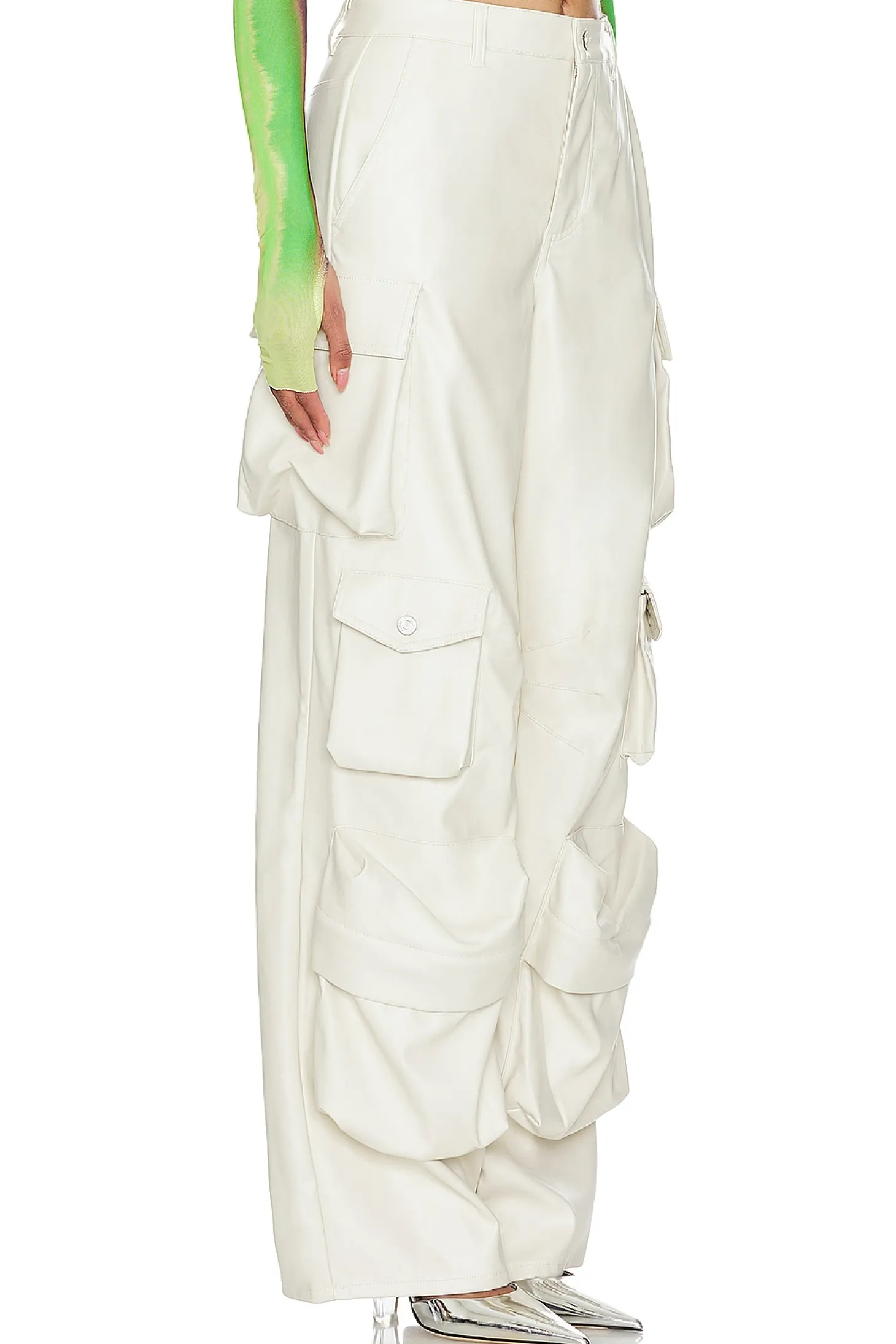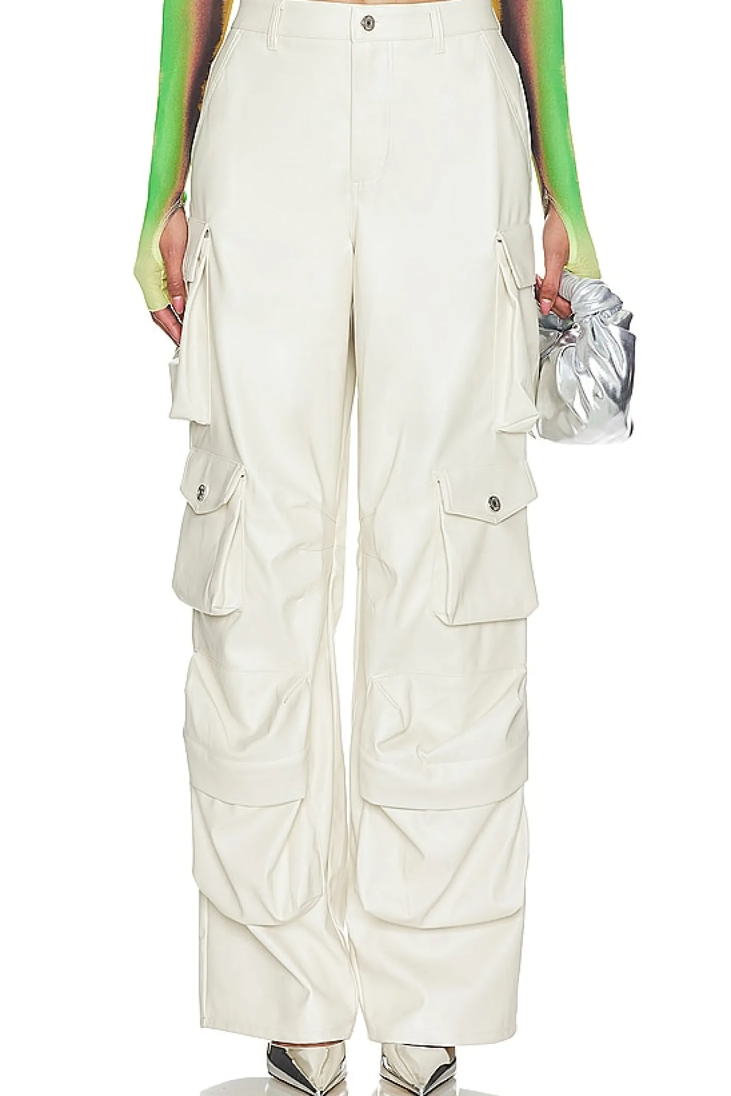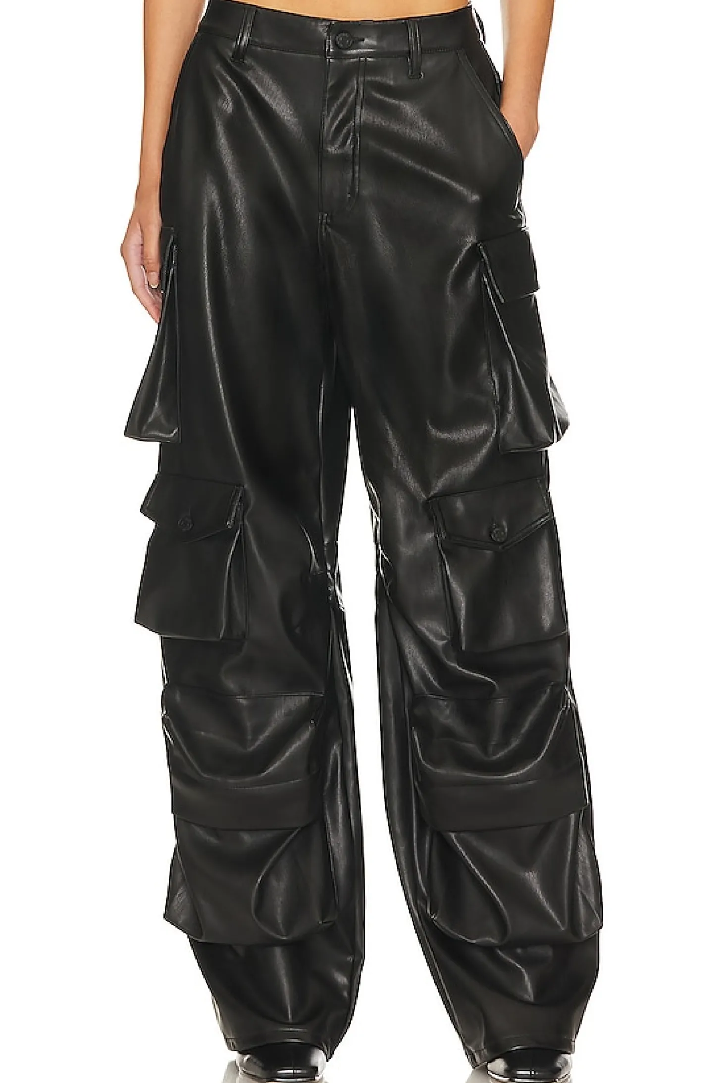100% polyurethane.Made in China.Hand wash.Zip fly with button closure.Side slip pockets.Cargo pocket design.Ruched faux leather fabric.22" at the knee narrows to 20" at the leg opening