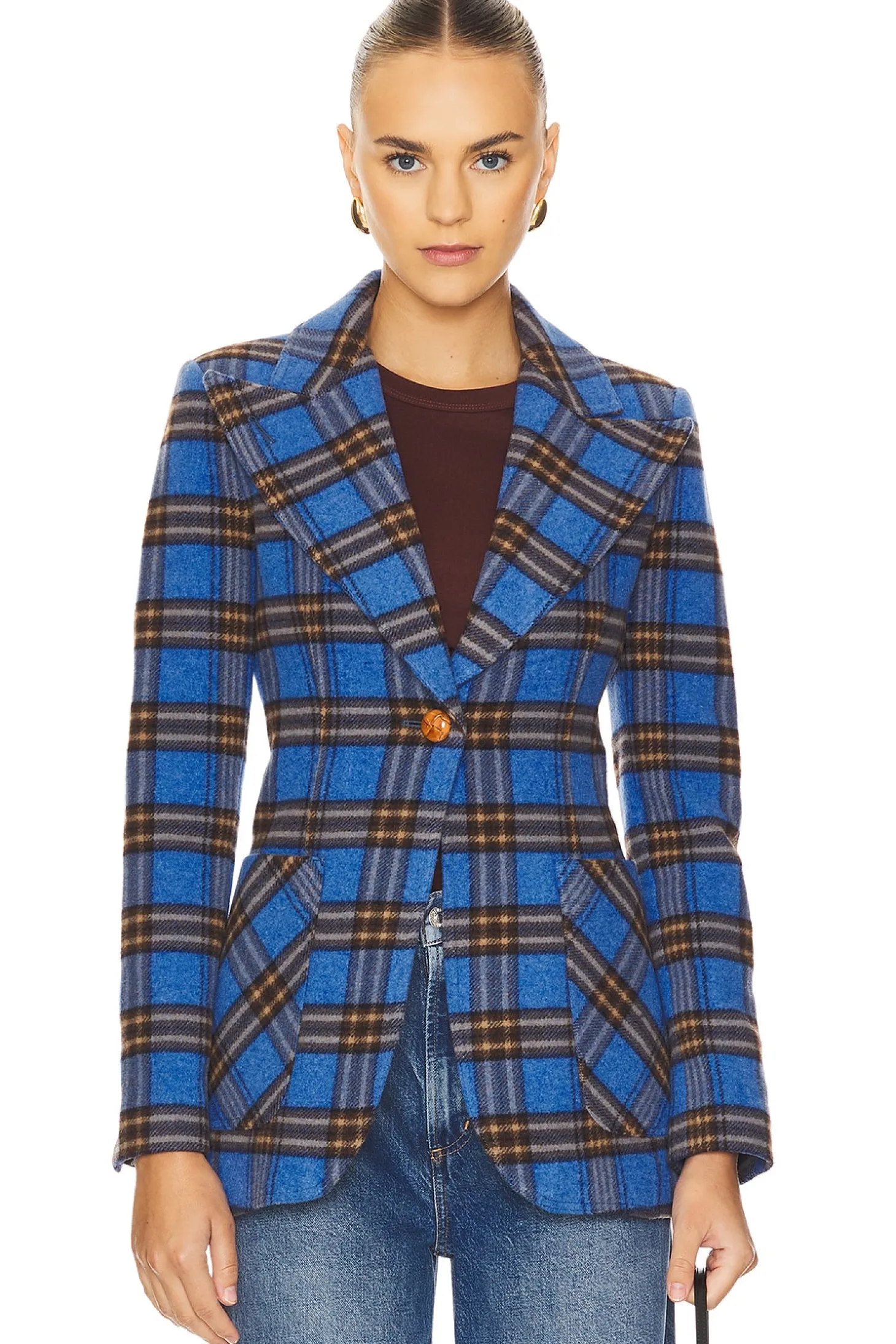Twill textile.Imported.Dry clean recommended.Singular front button closure.Light padding at shoulders.Buttoned cuffs.Front pouch pockets and back vent
