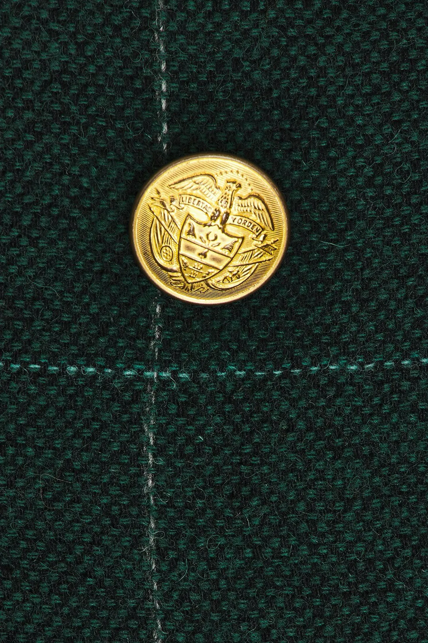 Tweed textile.Imported.Dry clean recommended.Front double-breasted button closure.Velvet collar.Light padding at shoulders.Side flap pockets Buttoned cuffs