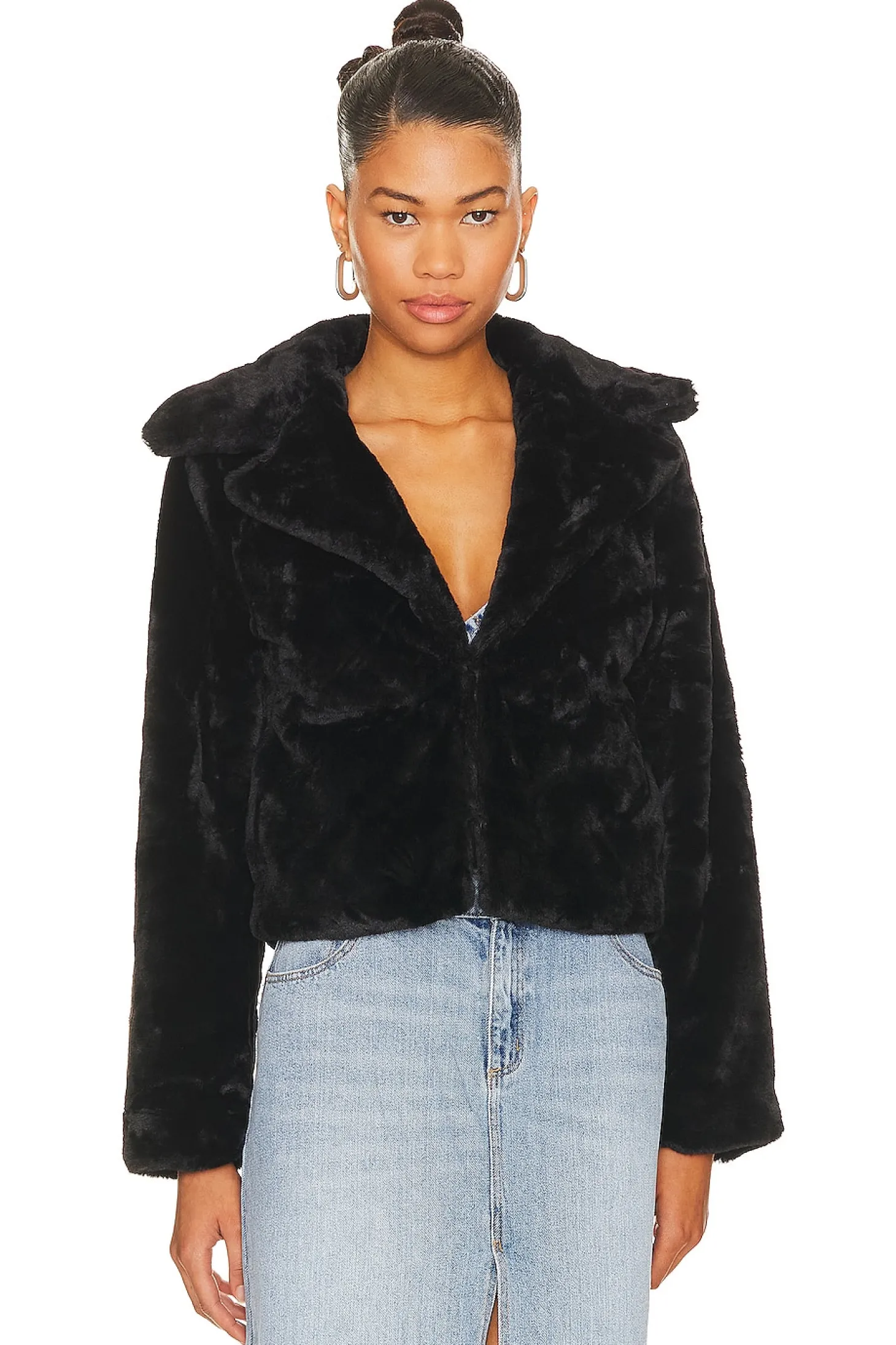 100% polyester.Made in China.Hand wash.Front hook and eye closure.Side slant pockets.Faux fur fabric