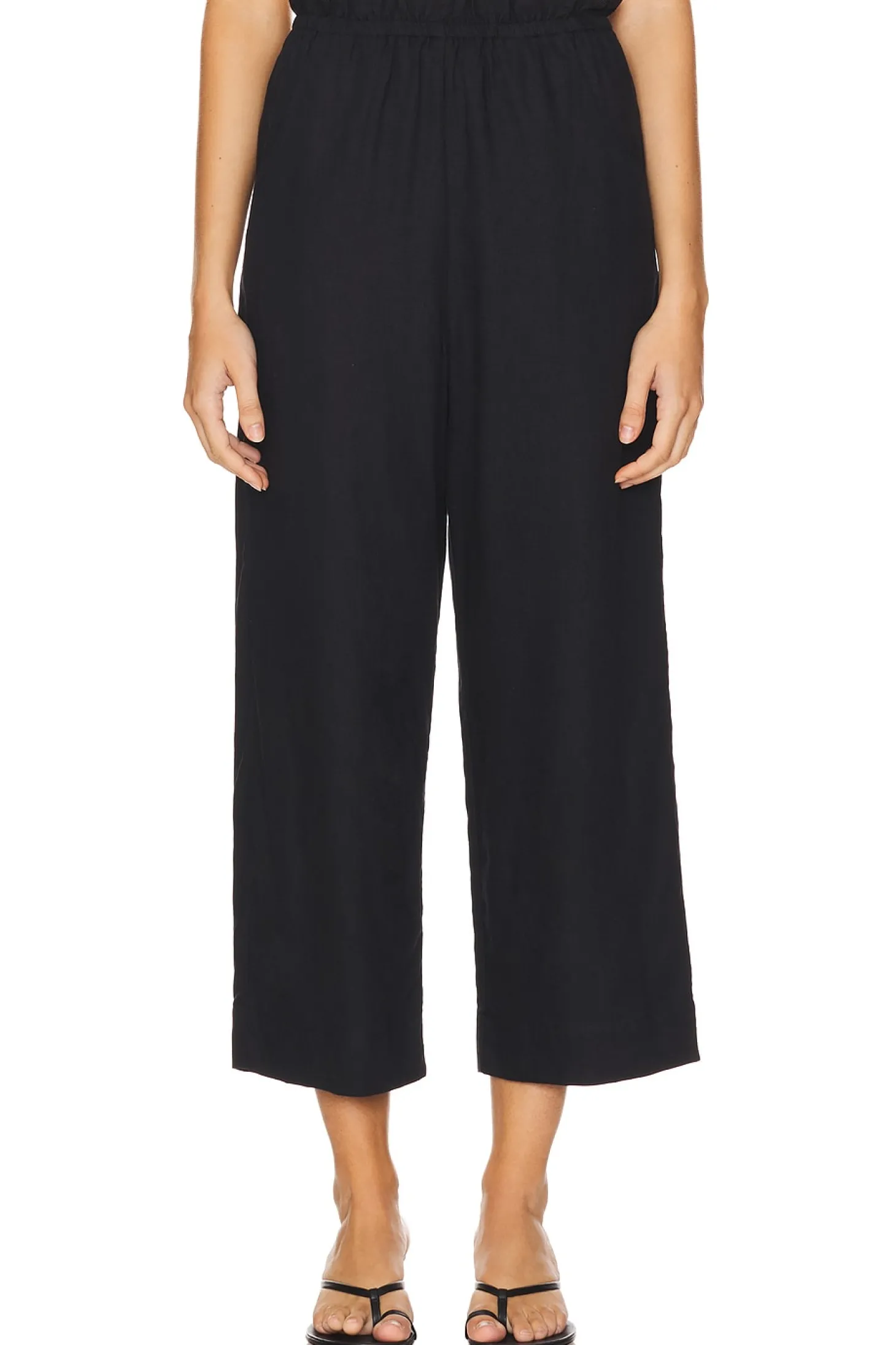 55% linen 45% rayon.Made in USA.Machine wash.Pull-on styling with paperbag waistband.Side seam pockets.Lightweight linen fabric.Item not sold as a set.22" at the knee narrows to 18" at the leg opening