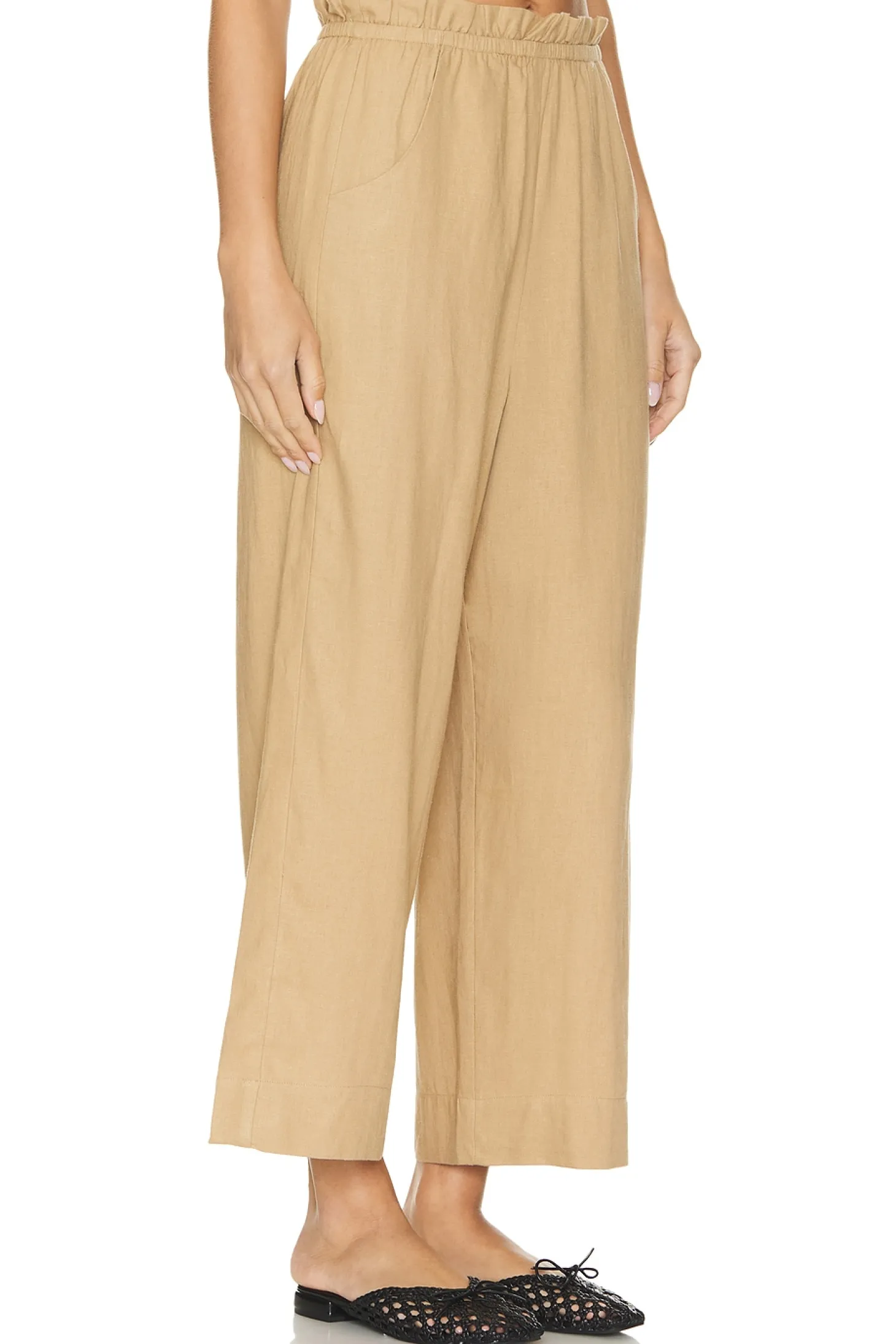 55% linen 45% rayon.Made in USA.Machine wash.Elastic waistband.Side slant pockets.20" at the knee narrows to 18" at the leg opening