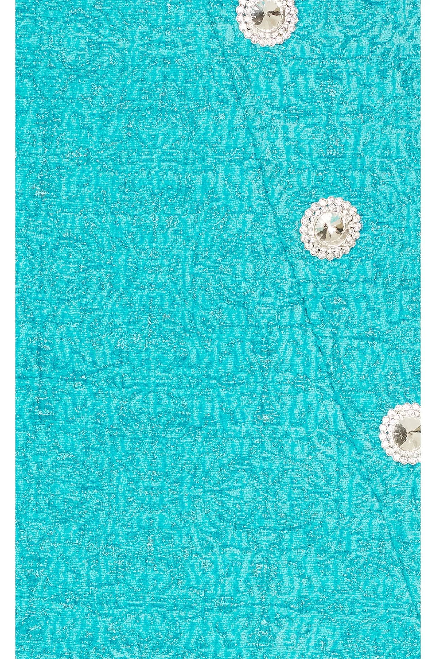 Self: 79% rayon 8% nylon 7% cotton 6% polyester Lining: 97% polyester 3% elastane.Made in China.Dry clean.Singular front button closure.Padded shoulders.Notched lapels Buttoned cuffs.Jacquard fabric with metallic threading.Item not sold as a set