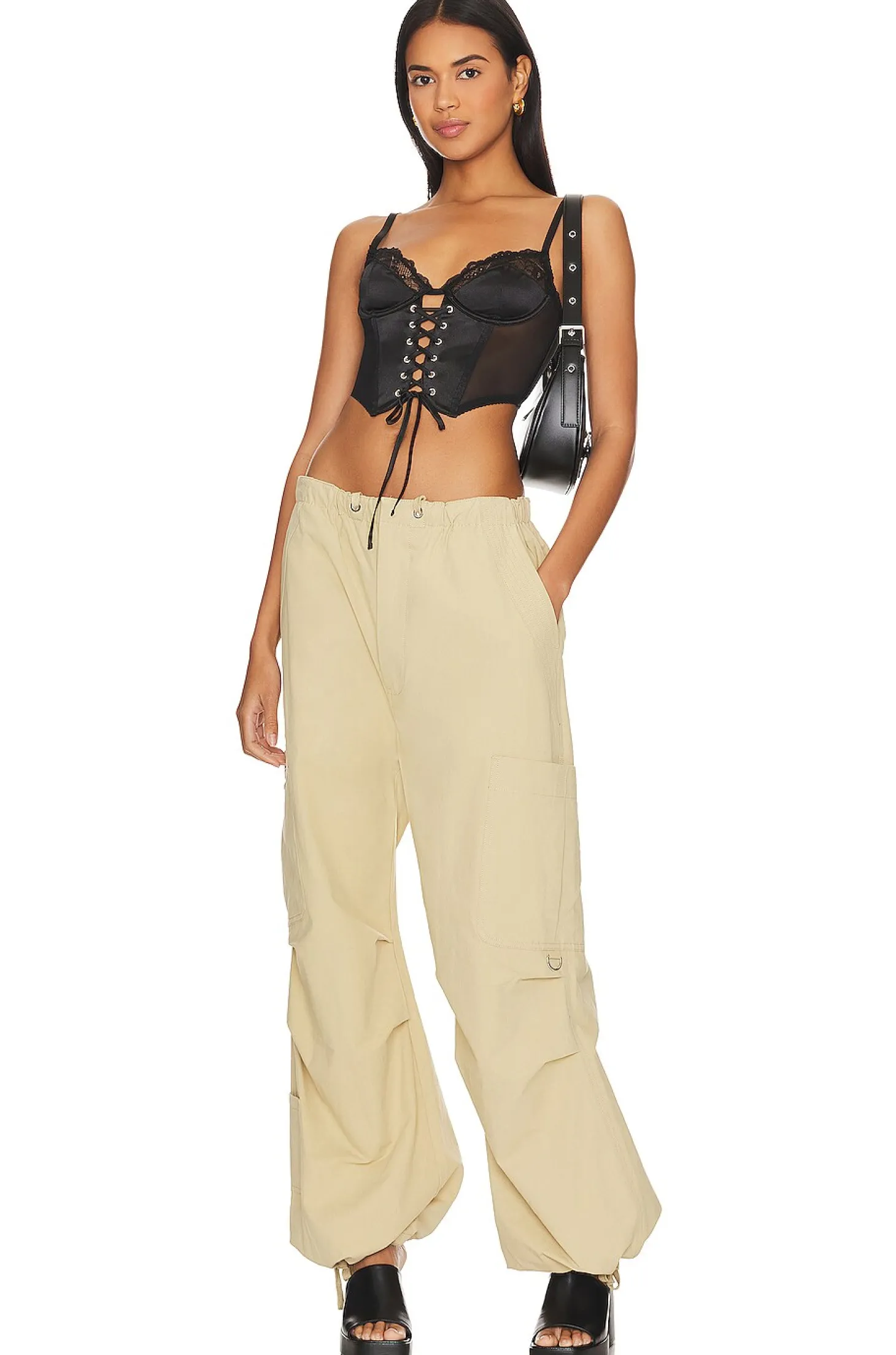 90% polyamide 10% elastane.Made in China.Hand wash.Unpadded underwire cups.Boned bodice with back hook and eye closure.Adjustable shoulder straps.Lace-up front.Mesh, lace and satin fabric Item not sold as a set