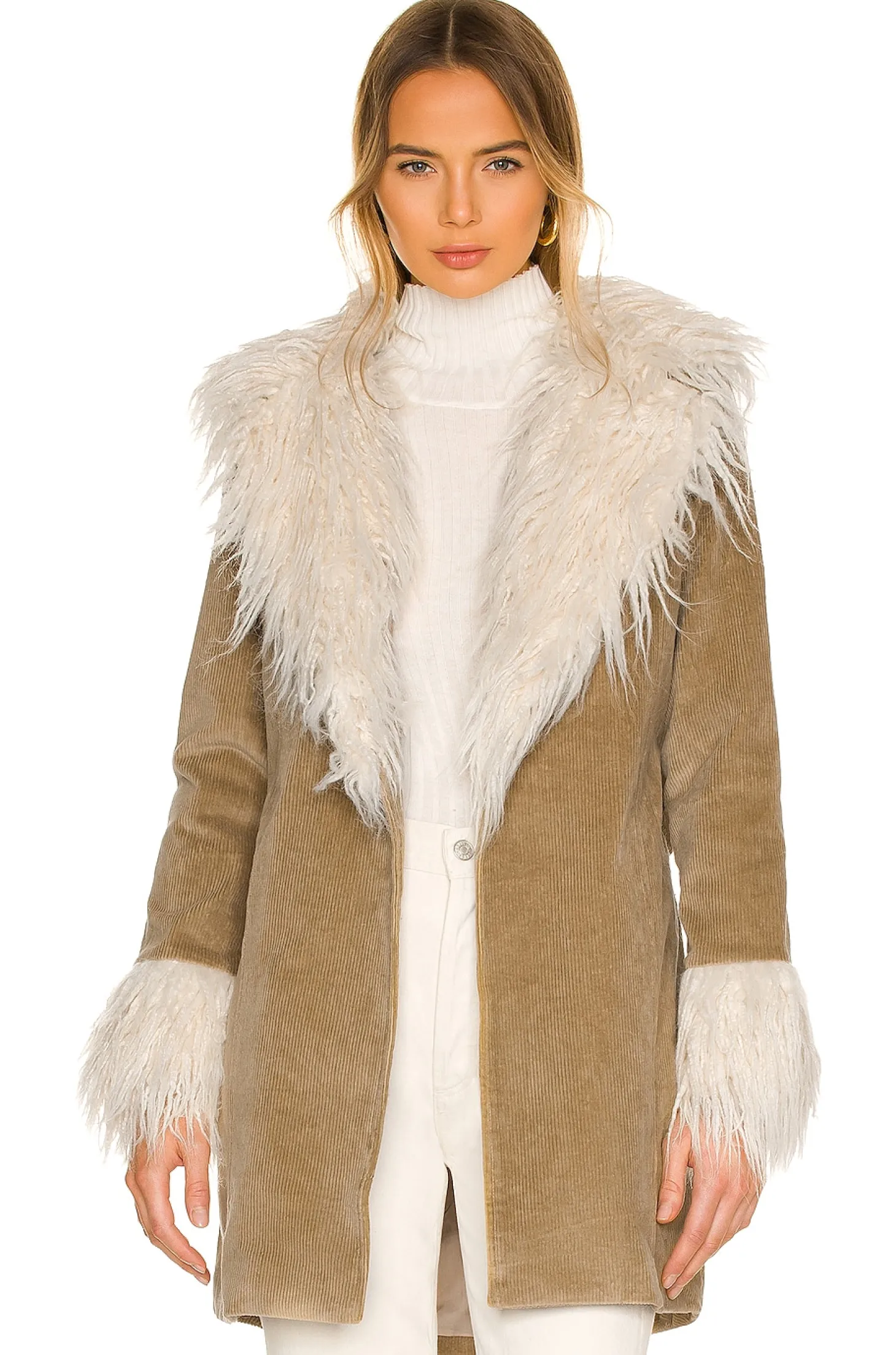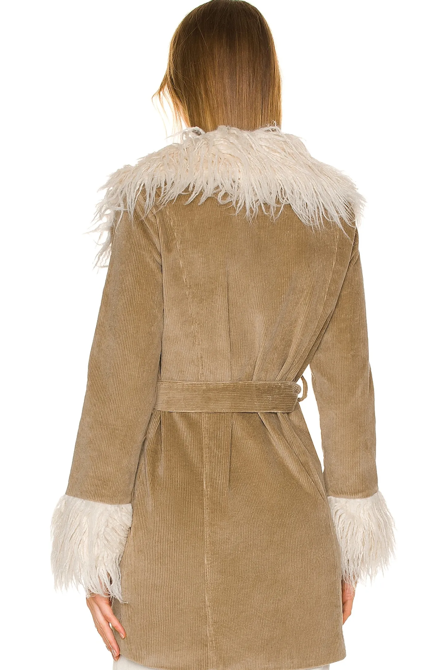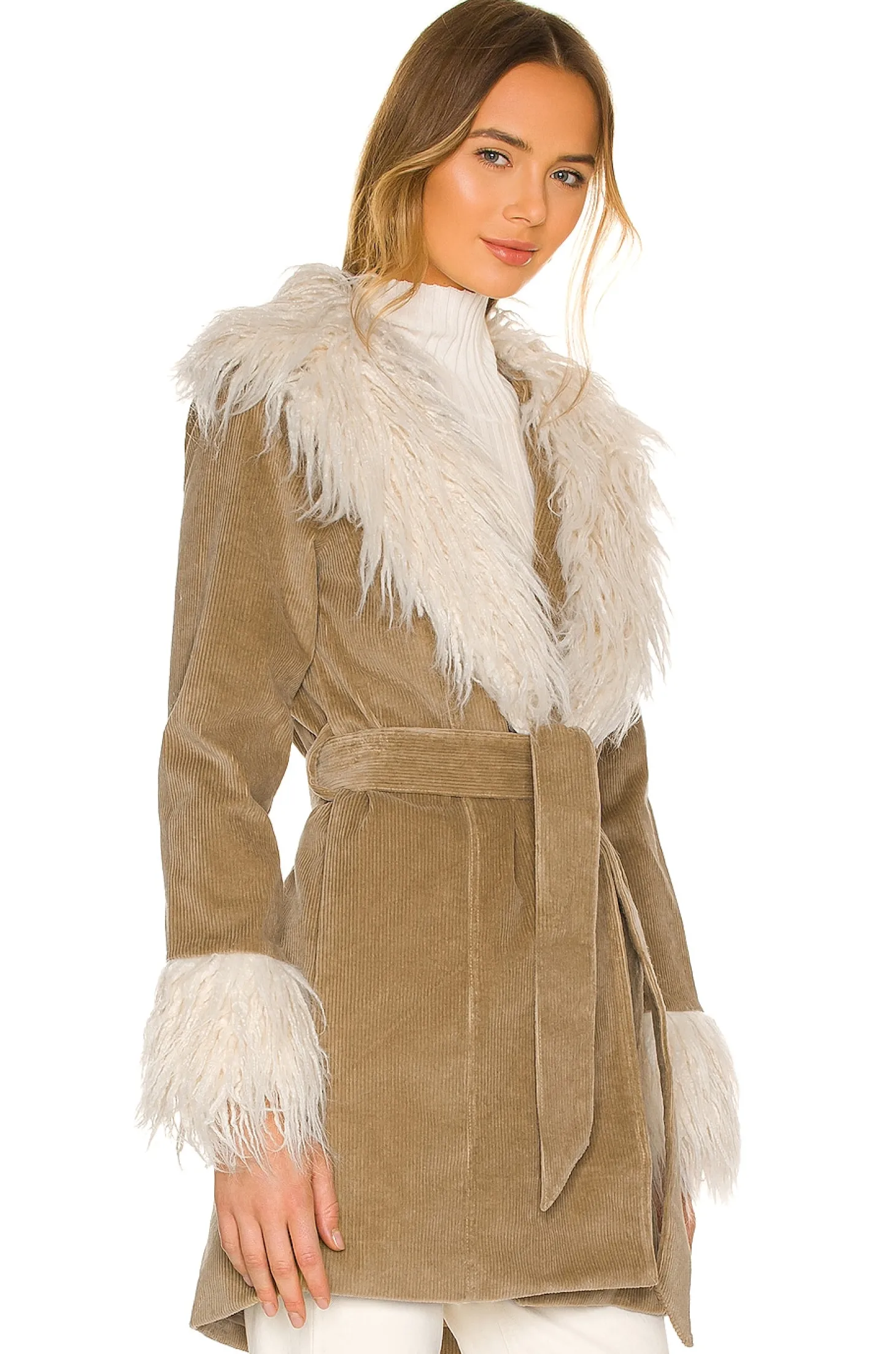 Self: 97% cotton 3% spandex Lining & Contrast Fabric: 100% poly.Made in China.Machine wash.Open front with detachable waist tie.Side seam pockets.Corduroy fabric with faux fur collar and cuffs