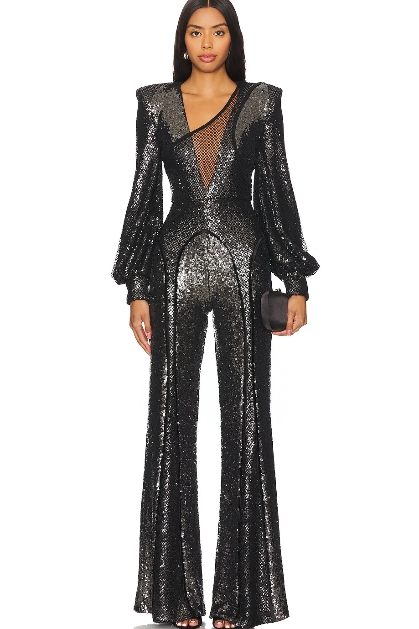Self: 100% polyester Lining: 92% polyester 8% spandex Contrast: 95% polyester 5% spandex.Made in China.Hand wash.Exposed back zipper closure.Padded shoulders.Sequin embellished fabric with mesh overlay
