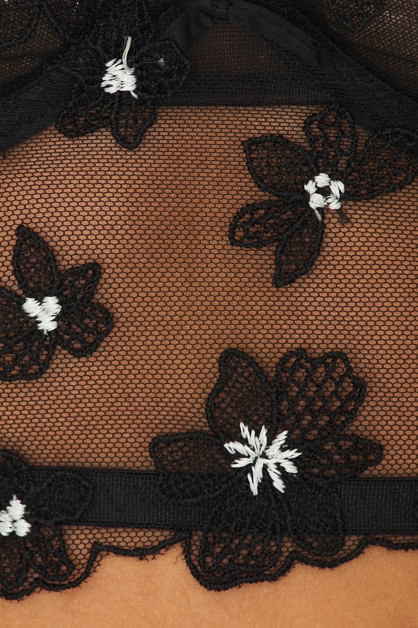Self: 100% polyester Combo 1: 67% viscose 29% polyamide 4% elastane Combo 2: 92% silk 8% elastane.Made in China.Hand wash.Exposed back zipper closure.Adjustable shoulder straps.Unpadded underwire bust with flower mesh detail.Item not sold as a set