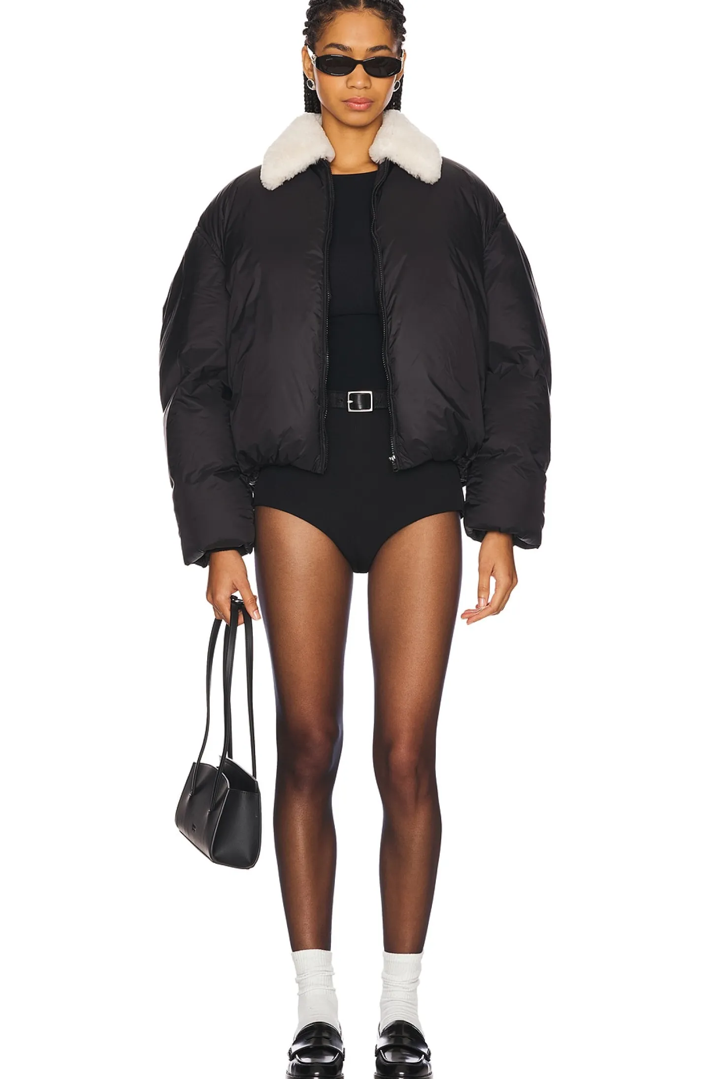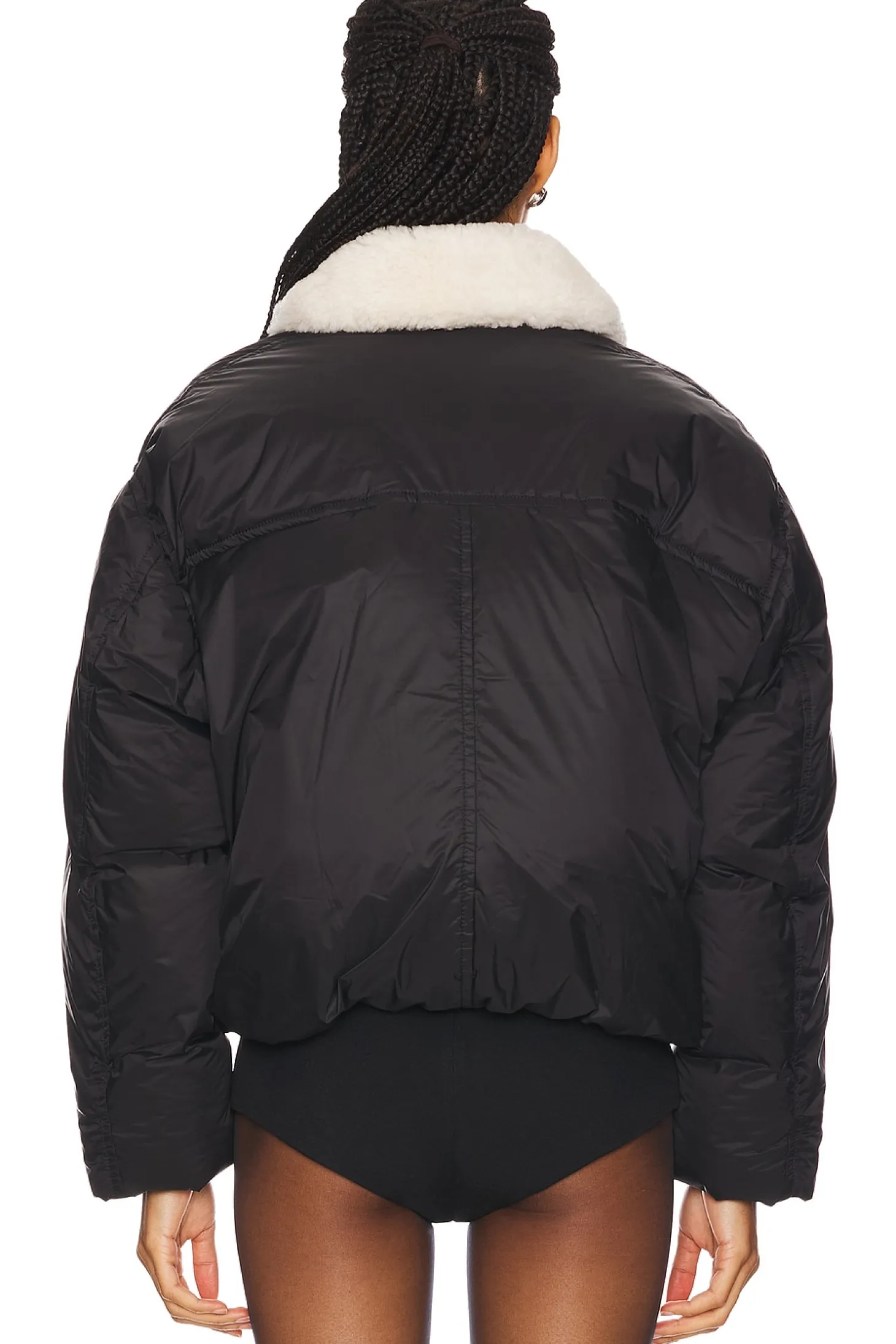Self 1: 100% nylon Self 2: 100% polyester Contrast Fabric: 100% dyed shearling.Made in Turkey Fur Origin: Turkey.Dry clean only.Hidden front zipper closure.Side seam pockets.Pull-cord waistband.Padded ripstop fabric