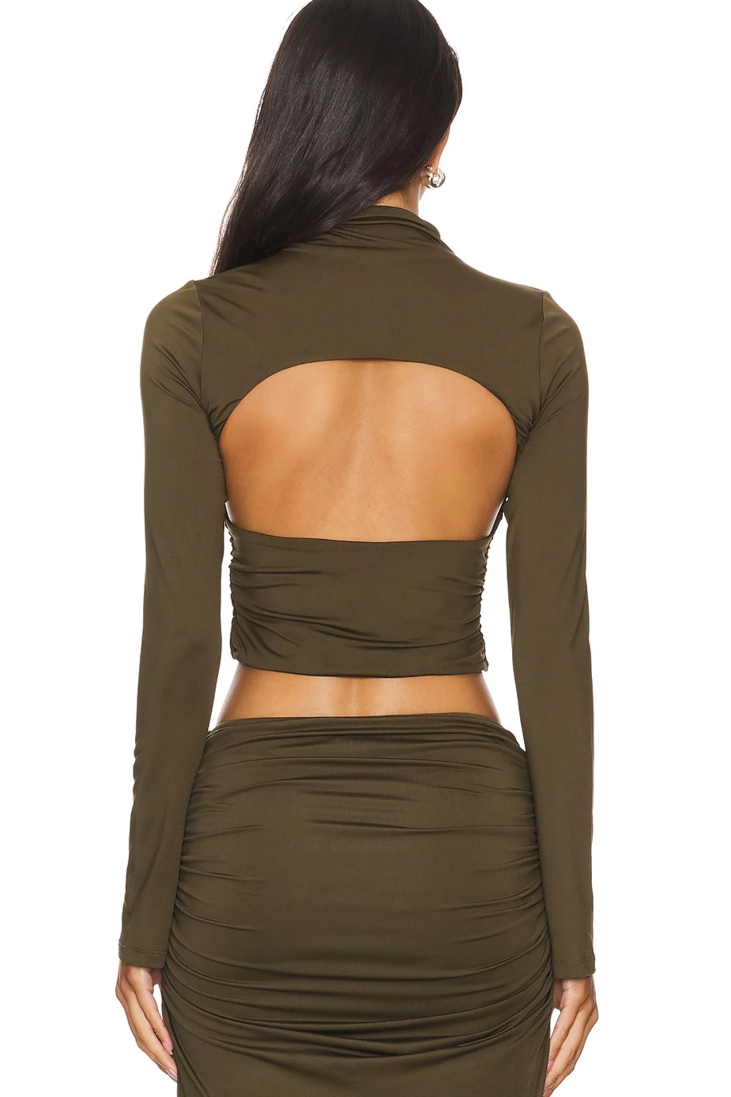 95% polyester 5% spandex.Made in China.Machine wash.Pull-on styling.Open back design.Ruched jersey fabric.Item not sold as set
