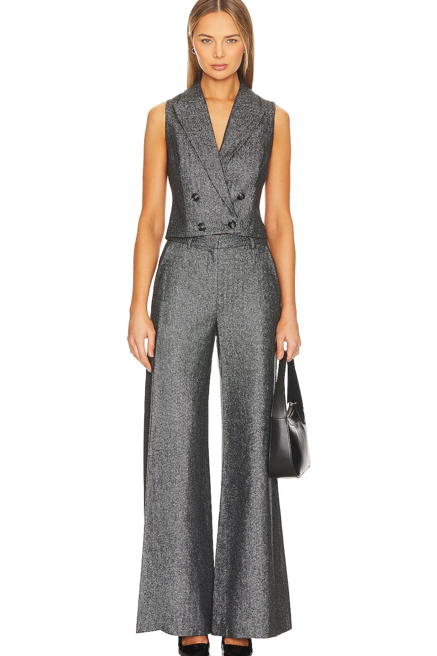 60% wool 27% nylon 9% polyester 4% other fibers.Made in China.Dry clean only.Zip fly with hook and bar closure.4-pocket styling.Metallic threading throughout.Herringbone fabric Item not sold as a set.23" at the knee breaks to 27" at the leg opening
