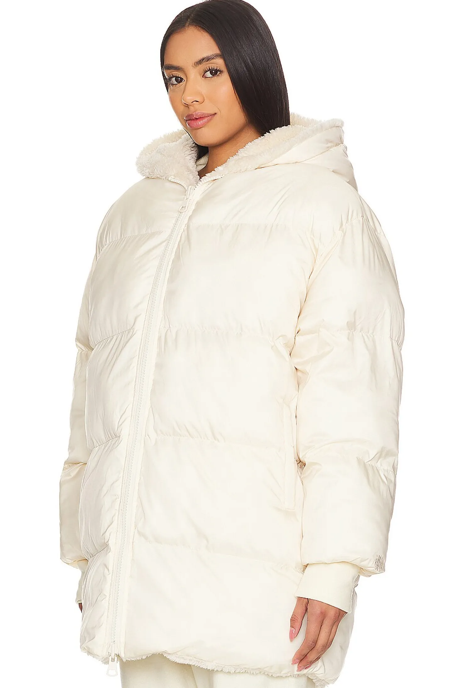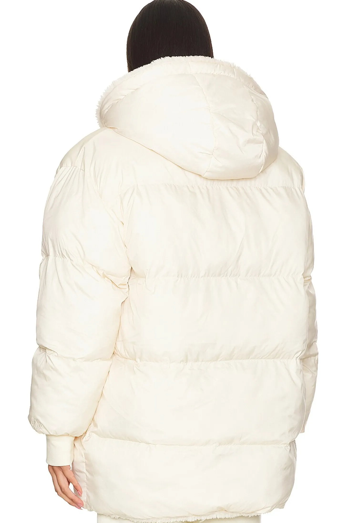 Self & Lining: 100% recycled polyester Filling: 100% polyester.Made in China.Dry clean only.Front zipper closure.Attached hood with faux fur lining.Puffer style ripstop fabric.Reversible styling