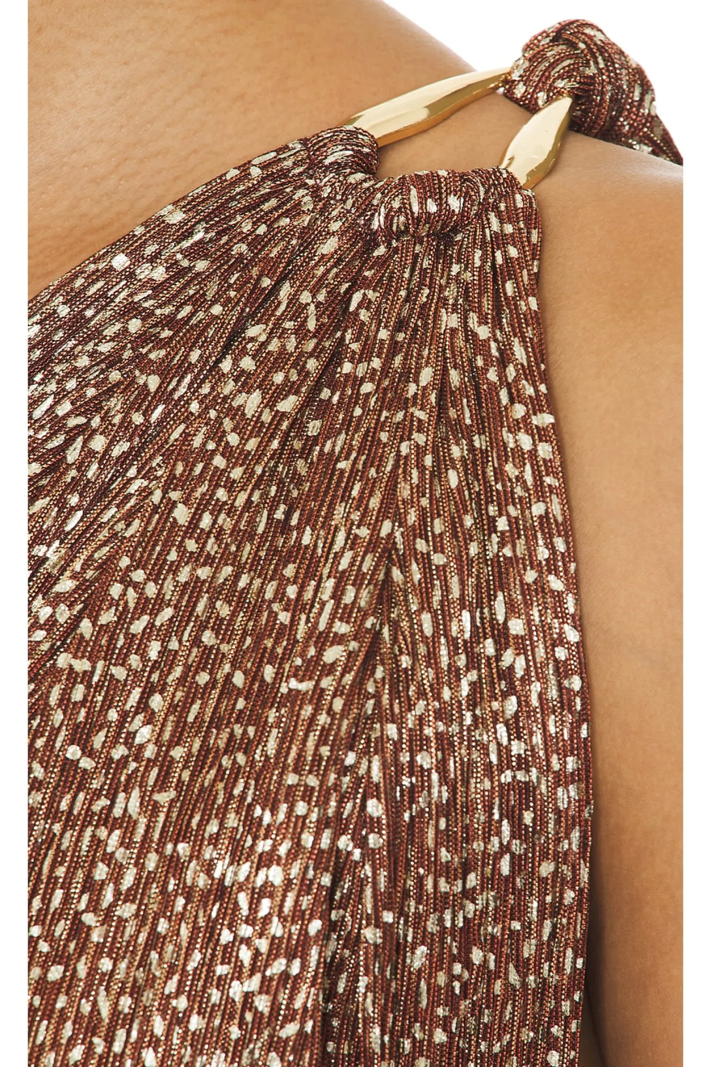 100% polyester.Made in Israel.Dry clean only.Pull-on one shoulder styling with gold-tone accent.Smocked waist.Lightweight pleated lam fabric