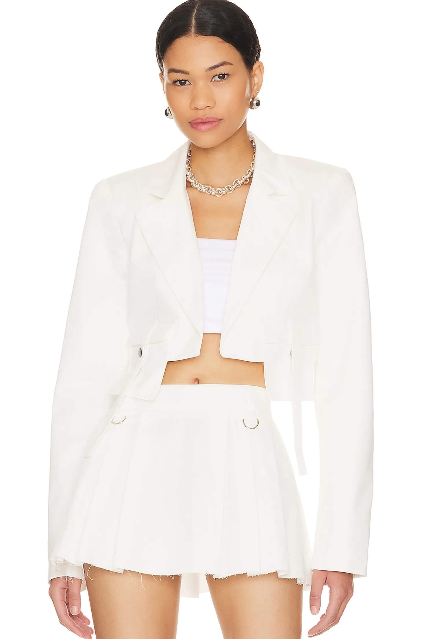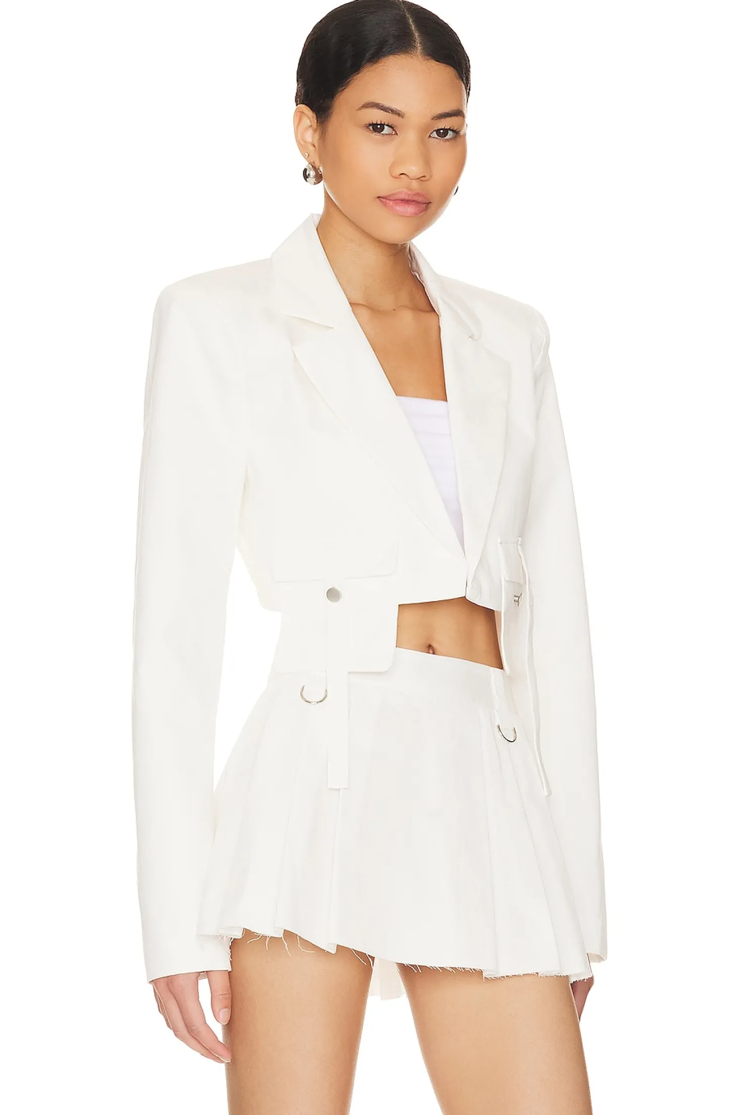 Self: 100% cotton Lining: 97% polyester 3% elastane.Made in China.Dry clean only.Open front.Padded shoulders.Notched lapels.Asymmetrical hem with flap pockets and button closure.Item not sold as a set