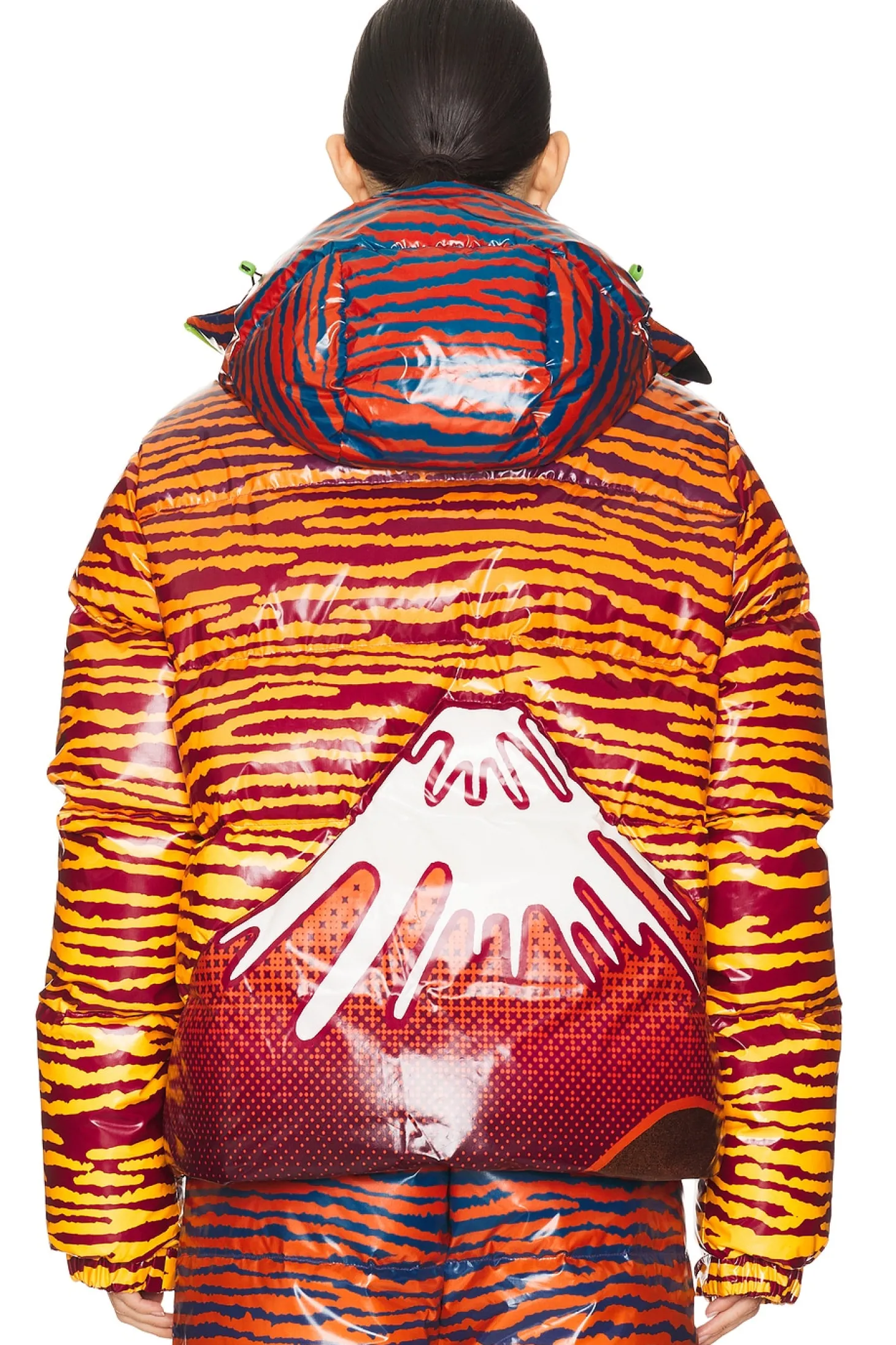 Self: 100% polyester Lining 1 & 3: 100% polyester Lining 2: 100% cotton Padding 1: 100% polyester Padding 2: 80% down 20% feathers.Made in Italy.Hand wash.Hidden front zipper closure.Side zip pockets.Pull-cord waistband and neckline.Padded ripstop fabric.Item not sold as set