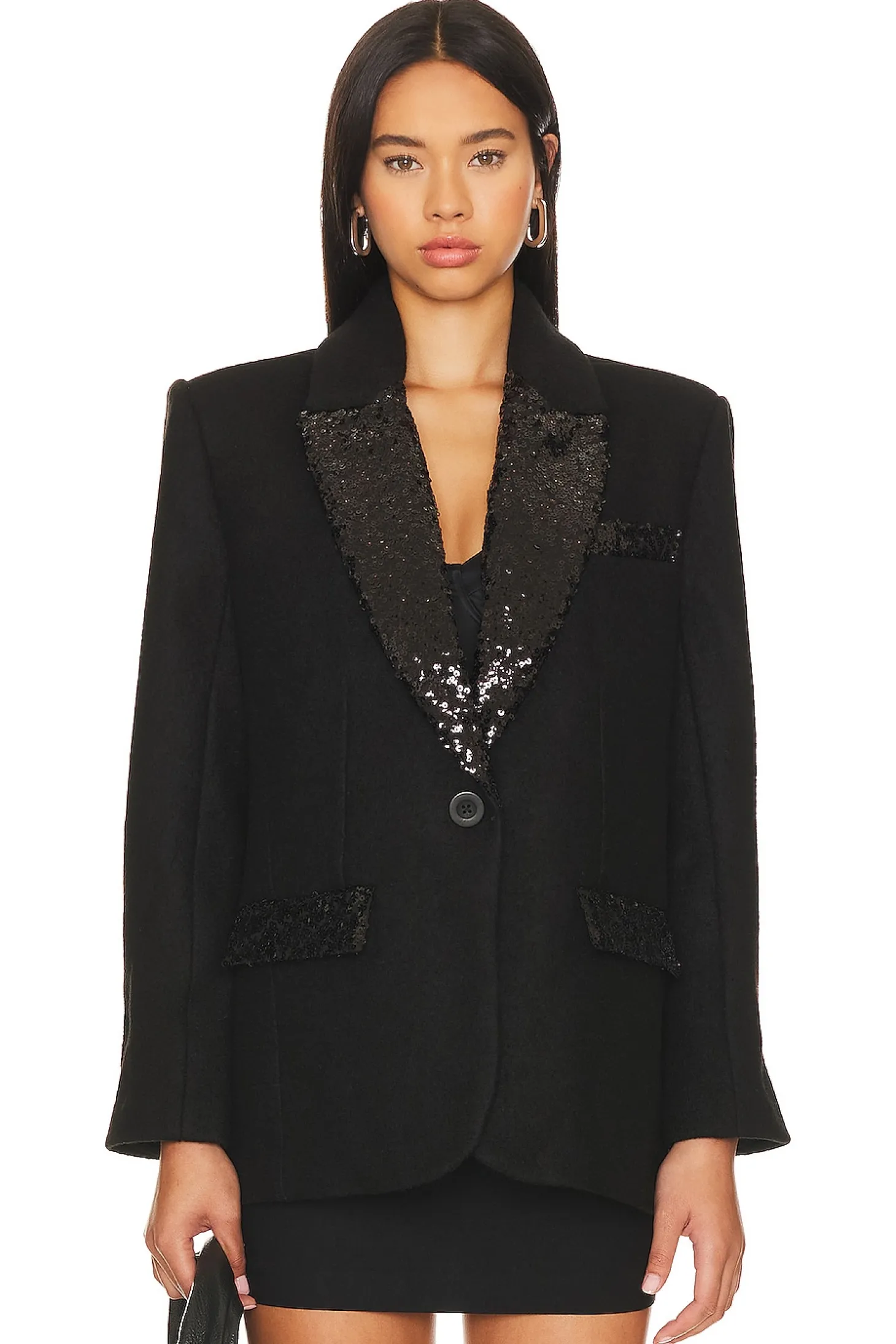 Step into the spotlight with the NBD Black Quincy Blazer. Featuring sequin-embellished trim, this bedazzled statement jacket is your ticket to head-turning style..Self: 100% wool Contrast Fabric: 100% polyester Lining: 55% polyester 45% viscose.Made in China.Dry clean only.Singular front button closure.Front welt pockets.Padded shoulders.Midweight melton fabric with sequin embellished trim