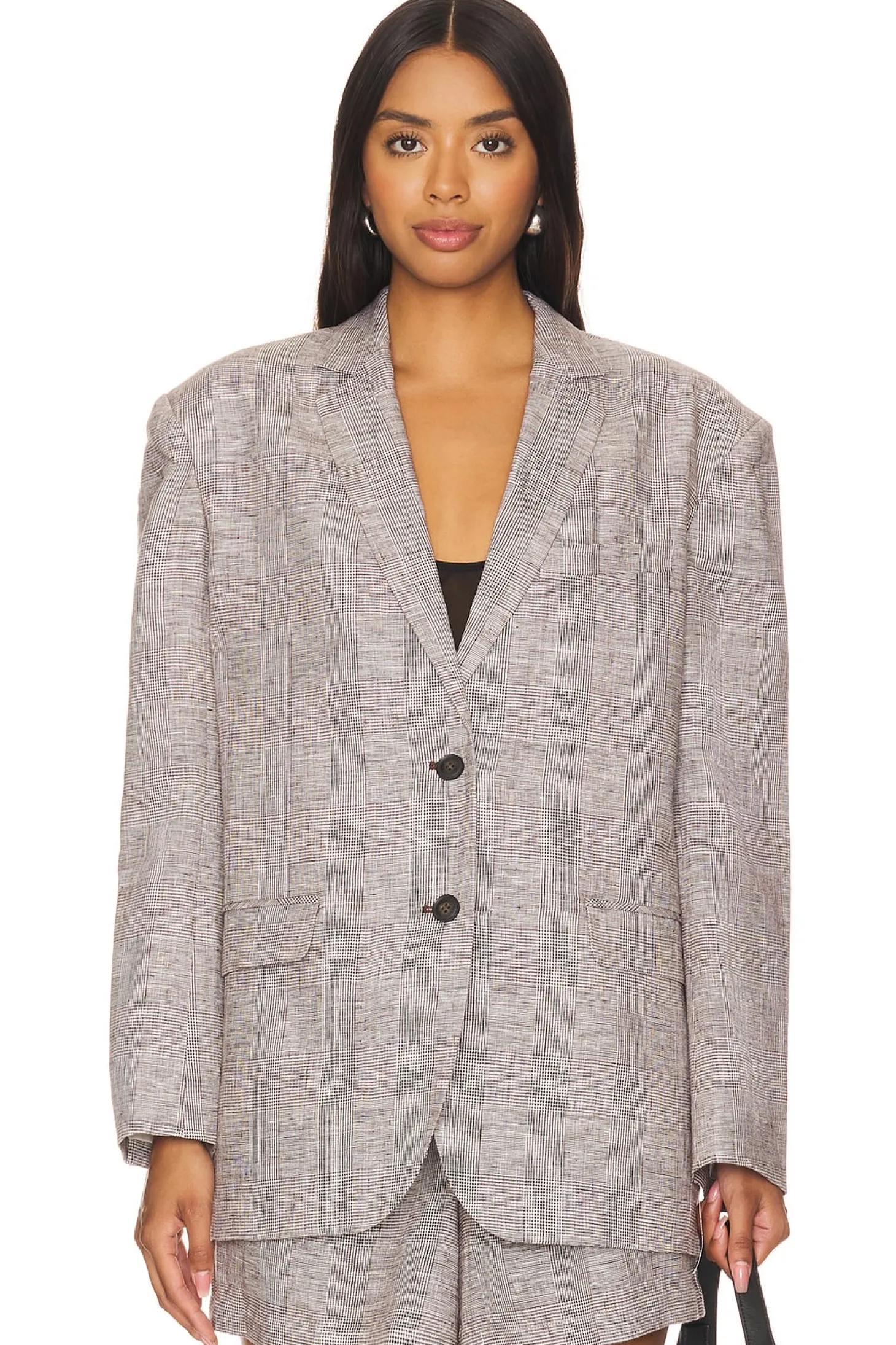 Self: 100% linen Lining: 57% polyester 43% viscose.Made in China.Machine wash.Front button closure.Front pockets and breast pockets.Attached shoulder pads.Item not sold as set.Linen fabric