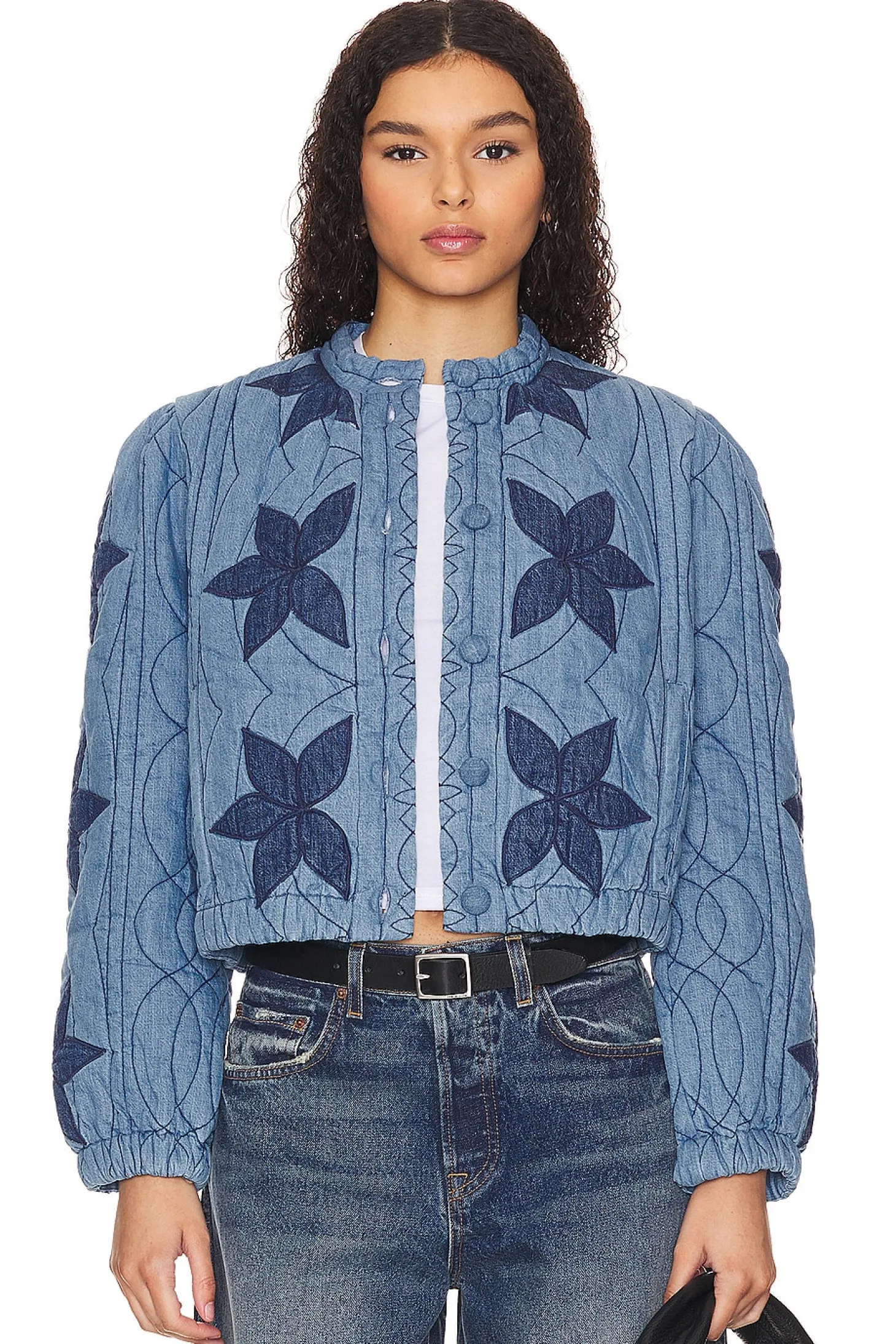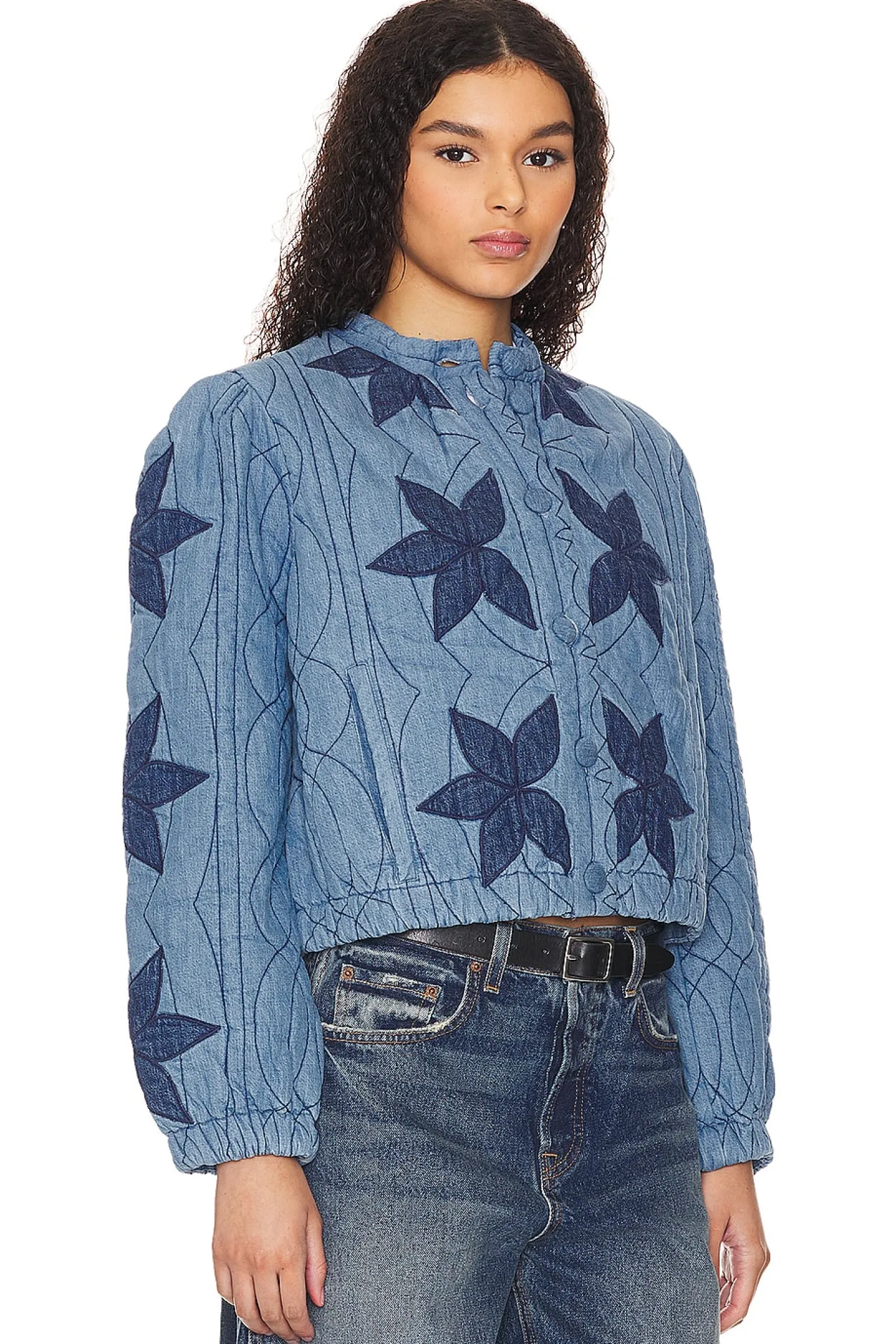 Keep warm with the Free People Quinn Quilted Jacket in the enchanting Indigo Combo. Embrace the whimsical charm of June gloom with this uniquely designed quilted jacket featuring delicate floral details. Whether you're strolling through misty mornings or adding a layer of cozy style to your evening look, the Quinn Quilted Jacket is the perfect choice..Self & Lining: 100% cotton Contrast Fabric & Fill: 100% polyester.Made in India.Dry clean only.Front button closure.Elastic cuffs.Quilted chambray fabric