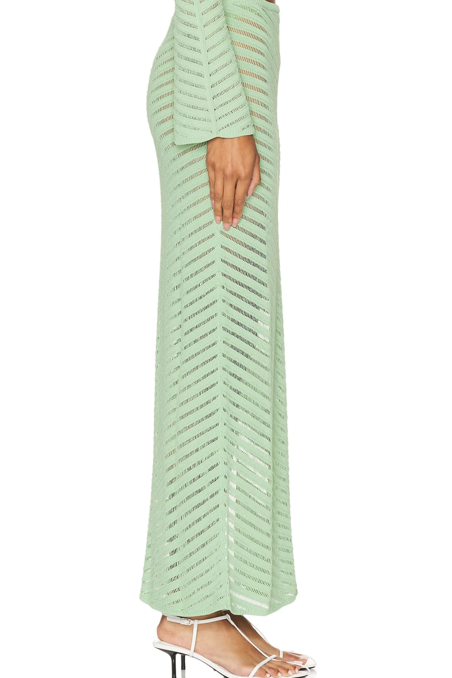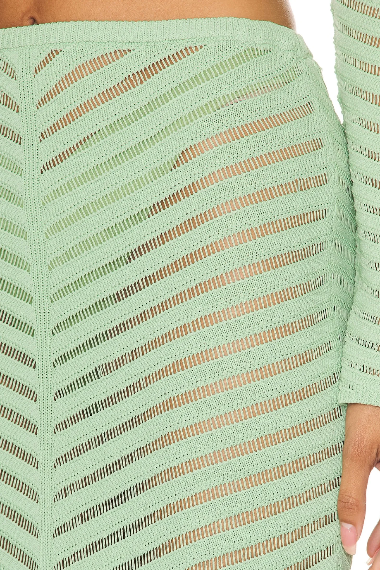 63% viscose 37% nylon.Made in China.Dry clean only.Unlined.Pull-on styling with elastic waistband Item not sold as set.Garment is intentionally sheer, undergarments will show through. Please note undergarment not included.Crochet knit fabric with side slit.Skirt measures approx 38" in length