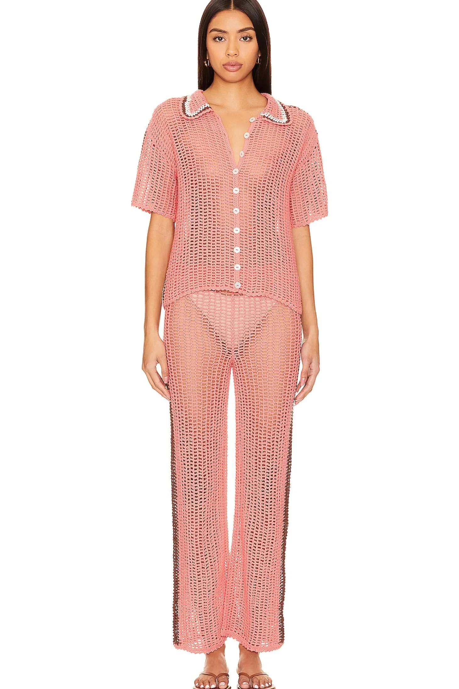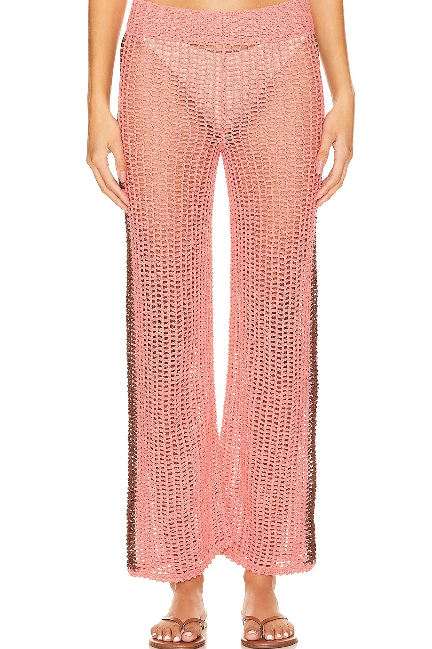 100% cotton.Made in Indonesia.Hand wash.Pull-on styling with elastic waistband.Open crochet knit fabric.Item not sold as a set.Garment is intentionally sheer, undergarments will show through. Please note undergarment not included.16" at the knee breaks to 18" at the leg opening