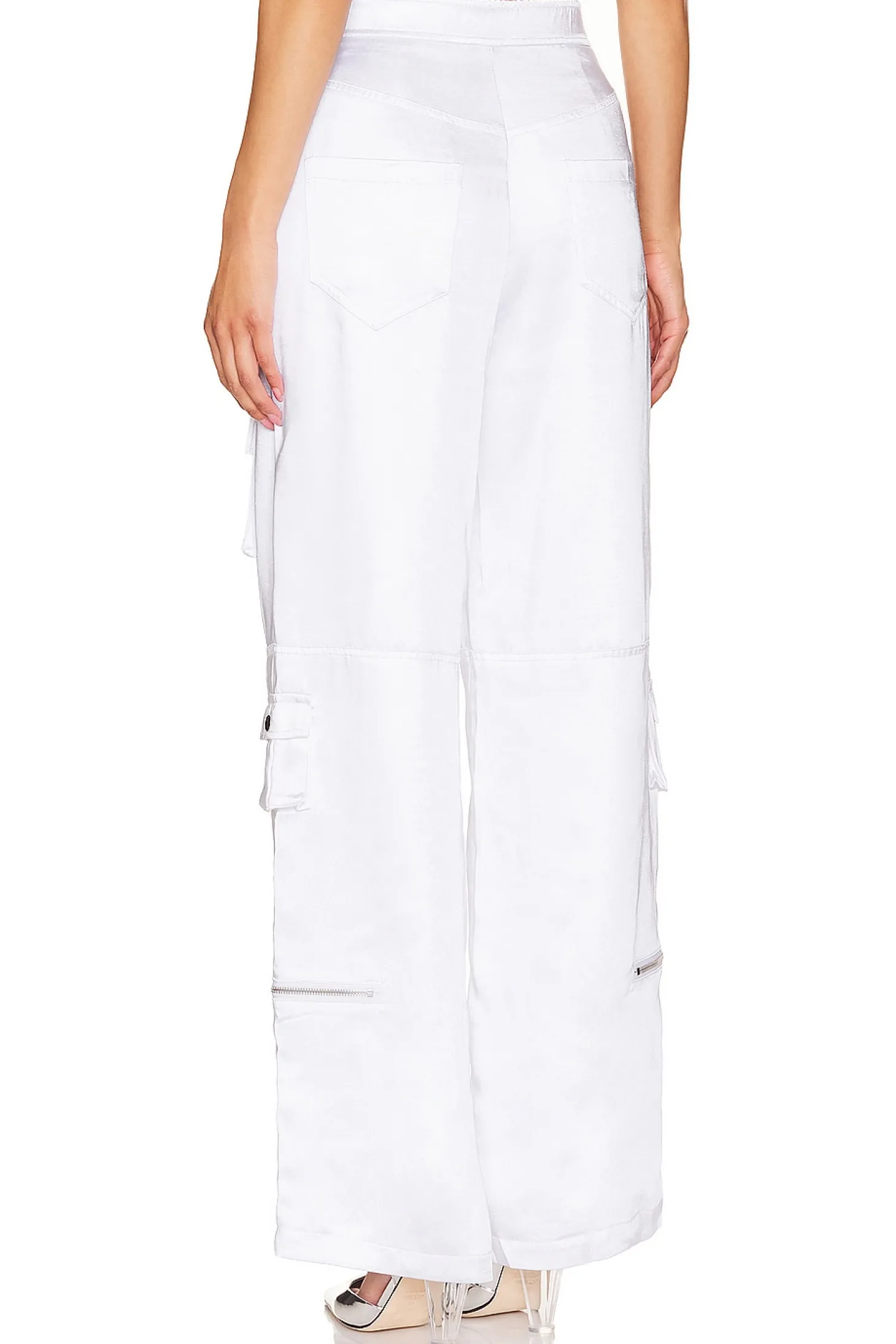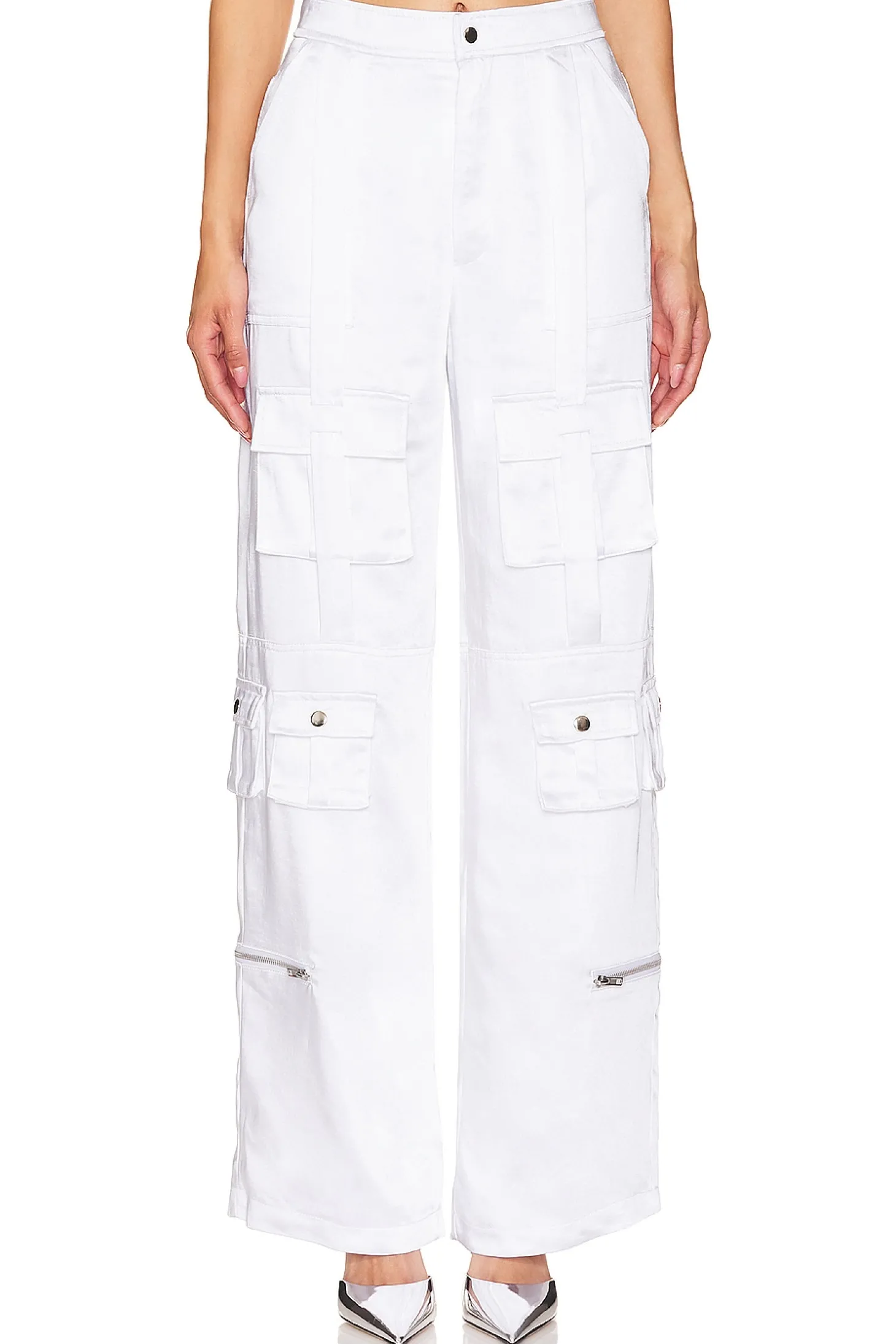 Self: 100% polyester Lining: 97% polyester 3% elastane.Made in China.Machine wash.Zip fly with button closure.10-pocket styling includes 6 cargo flap pockets.Side zipper detail near hem.Satin fabric Item not sold as set.20" at the knee breaks to 21" at the leg opening