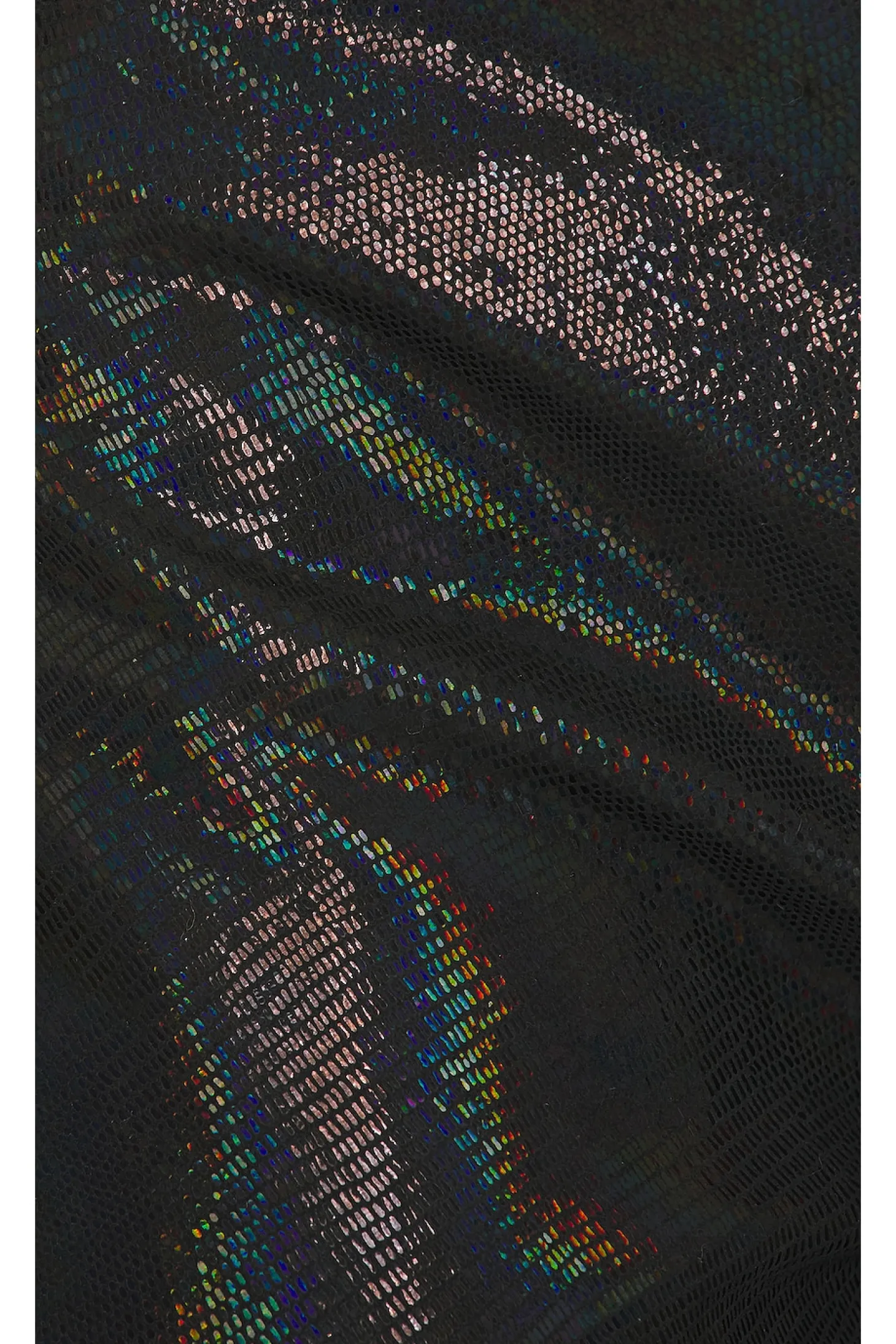 Self: 100% lamb leather Lining: 100% polyester.Made in China.Professional leather clean only.Zip fly with button closure.5-pocket styling.Split cuffs.Suede fabric with holographic finish.14" at the knee and 14" at the leg opening