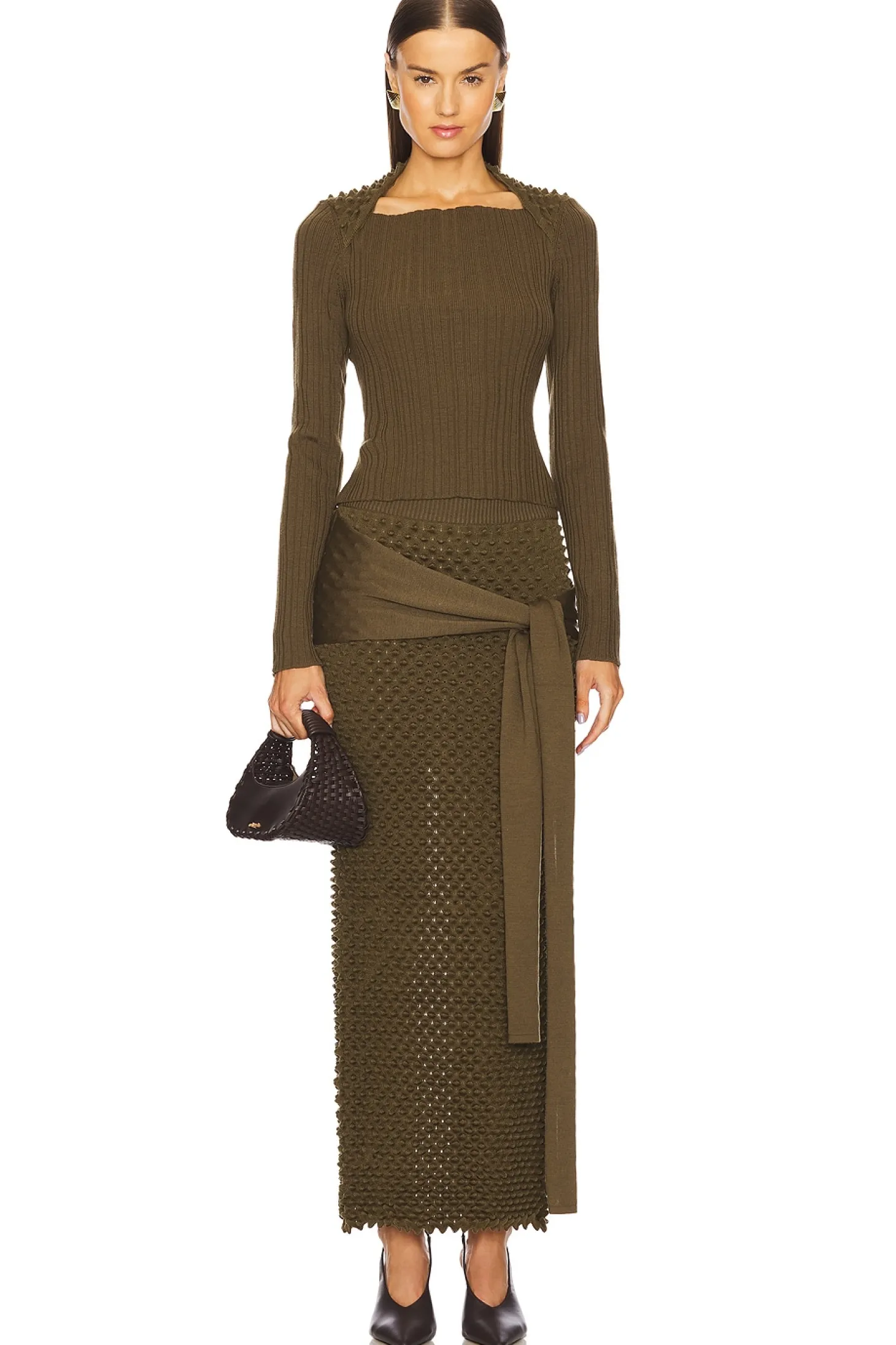 89% merino wool 11% polyamide.Made in Italy.Hand wash.Pull-on styling.3D textured design fabric.Midweight ribbed knit fabric Item not sold as set