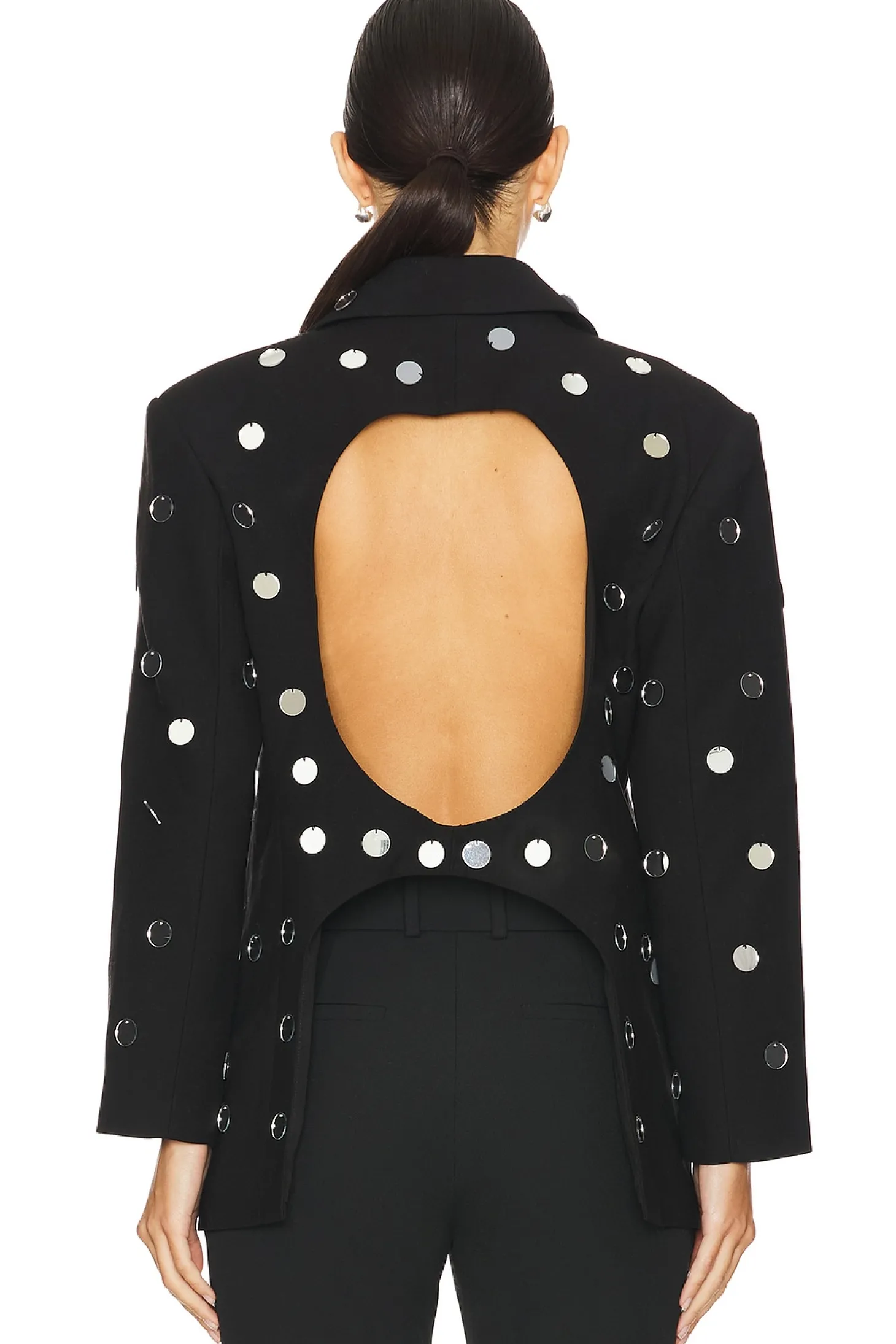 Suit textile.Imported.Dry clean only.Front button closure.Back cutout and padded shoulders Front faux flap pockets.Notched lapel collar Midweight suit fabric with allover sequin detailing
