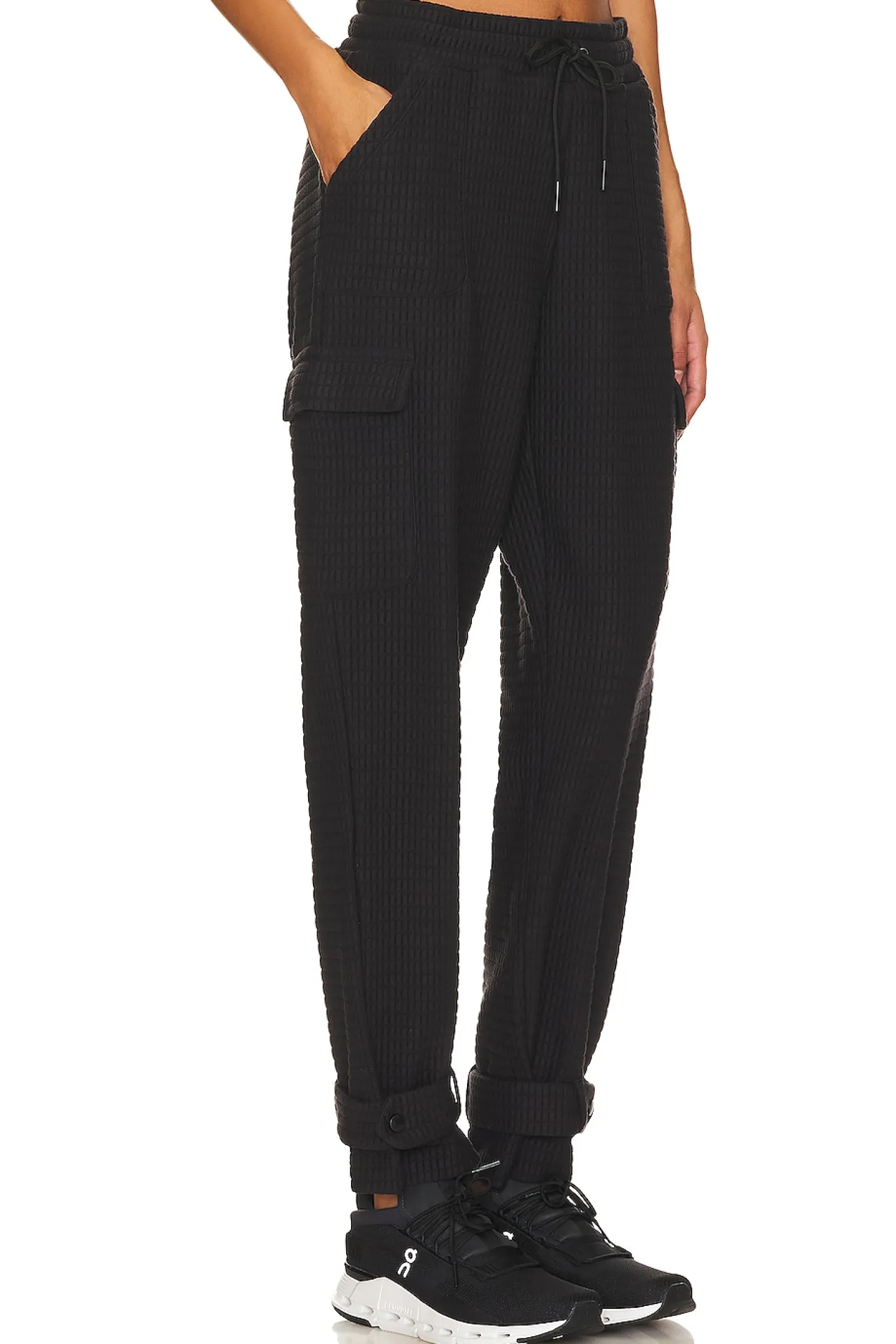 86% polyester 13% cotton 1% spandex.Made in China.Machine wash.Elastic drawstring waistband.Side slant pockets and cargo style pockets.Cuff tabs with snap button closure.Textured jersey fabric.18" at the knee narrows to 16" at the leg opening