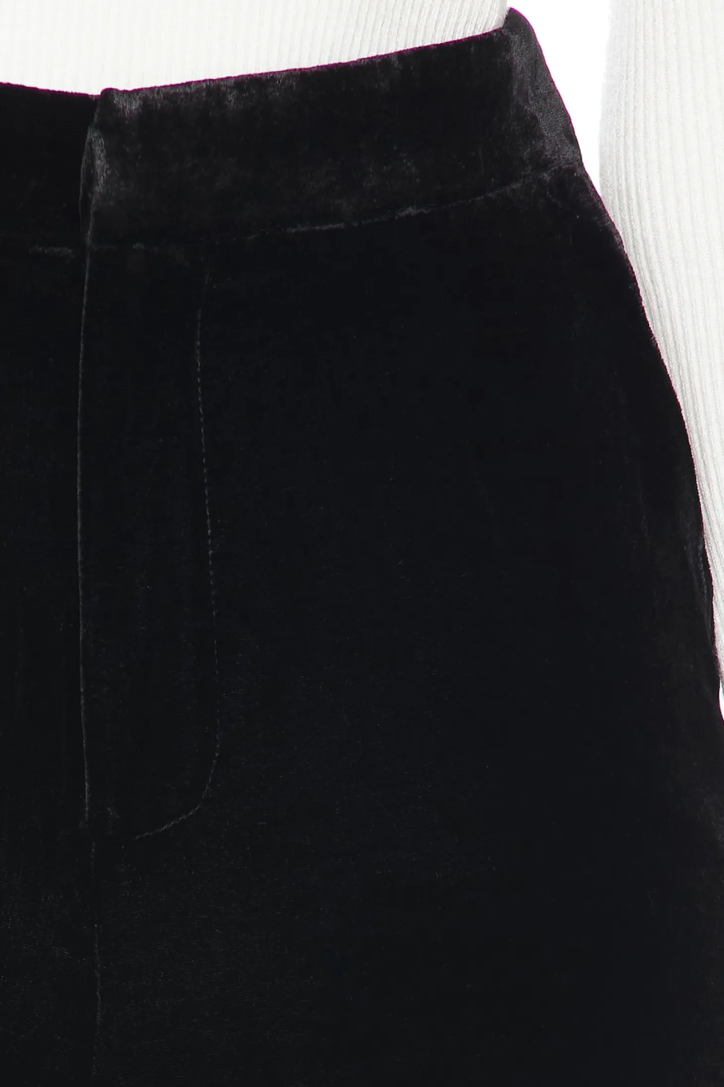 Self: 82% viscose 18% silk Contrast Fabric: 100% polyester.Made in China.Dry clean only.Zip fly with hook and bar closure.Side pockets.Lightweight velvet fabric.18" at the knee narrows to 14" at the leg opening