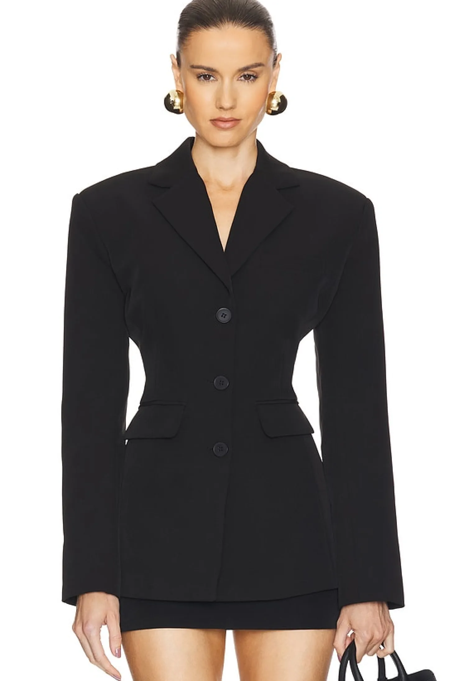 Self: 57% polyester 36% recycled polyester 7% spandex Lining: 55% polyester 45% viscose.Made in China.Dry clean.Front button closures.Breast welt pocket and front flap pockets.Padded shoulder and buttoned cuff.Crepe twill fabric with darted waist.Item not sold as a set Runs small; consider sizing up one size