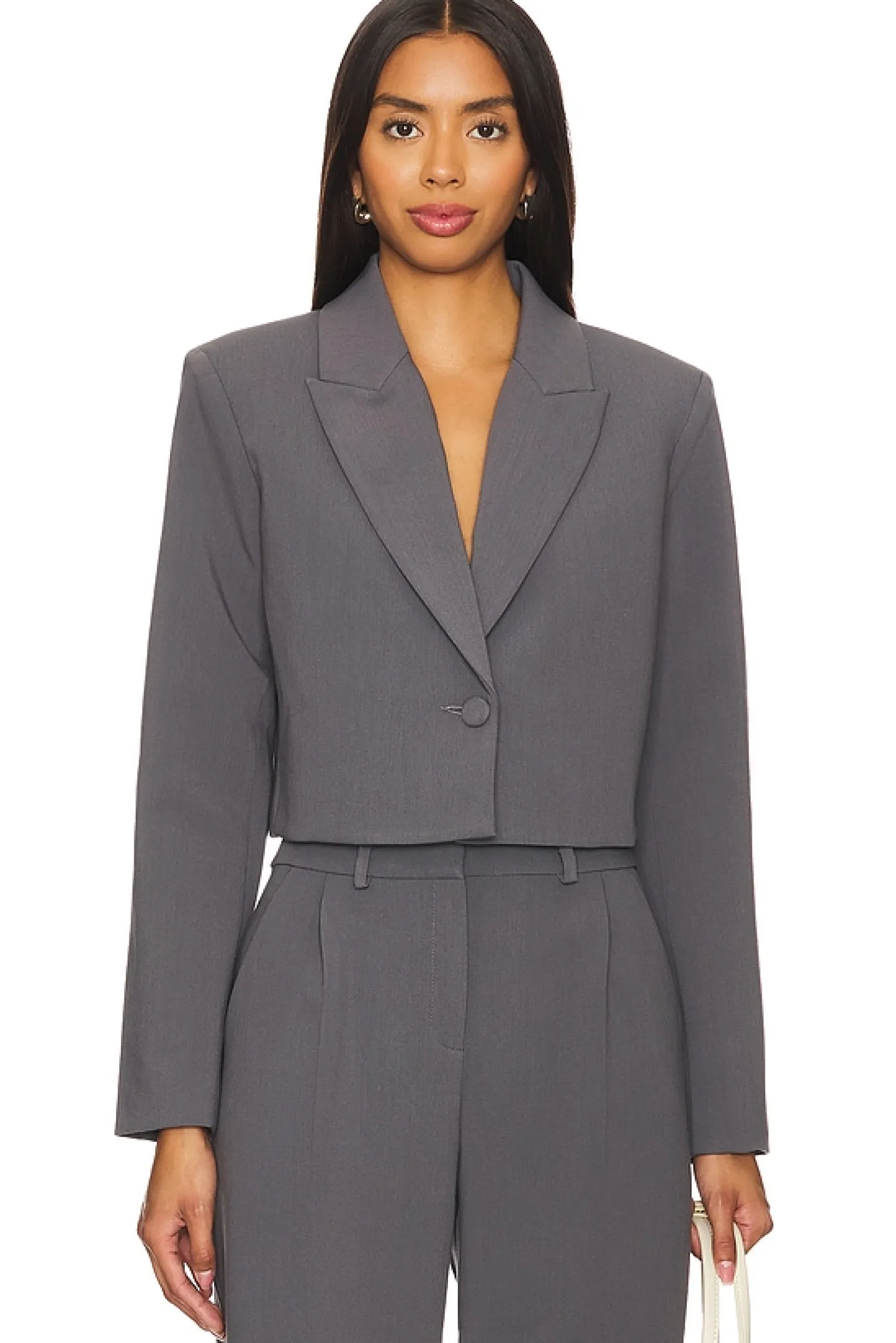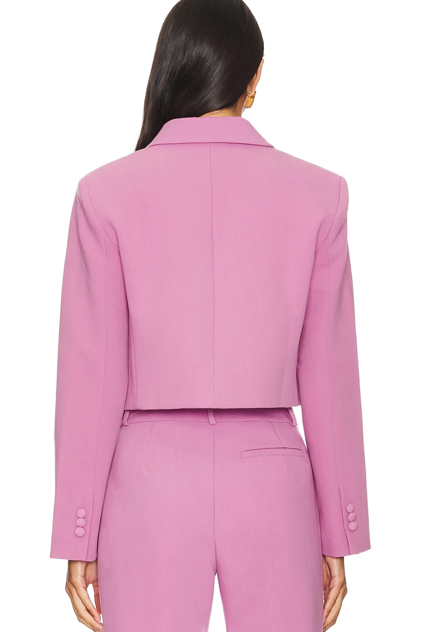 Self: 75% polyester 19% viscose 6% elastane Lining: 100% polyester.Made in USA.Dry clean only.Singular front button closure.Padded shoulders.Button cuffs.Midweight crepe fabric.Item not sold as a set