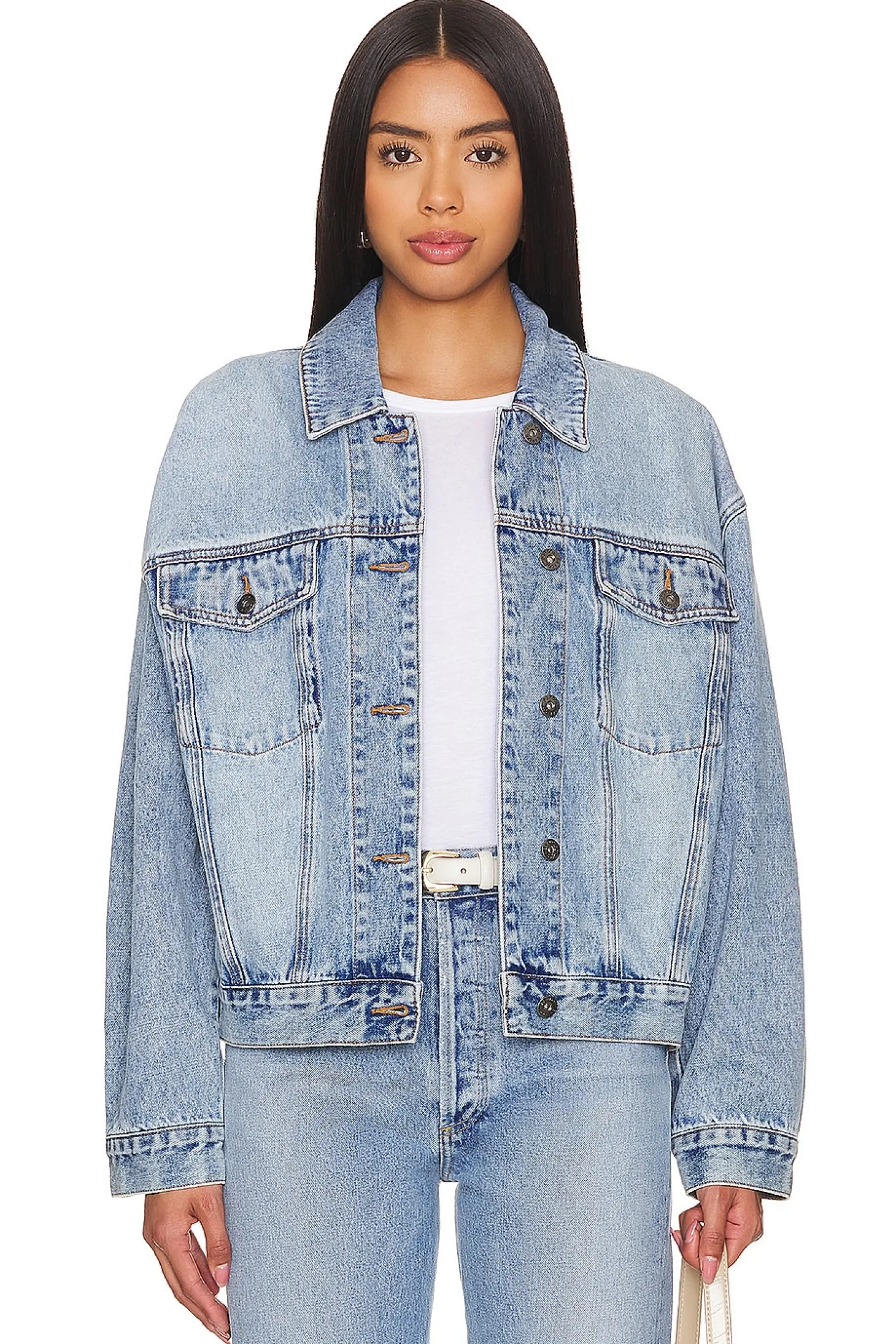 100% cotton.Made in China.Machine wash cold.Front button closure.4-pocket design.Button cuffs.Midweight denim fabric