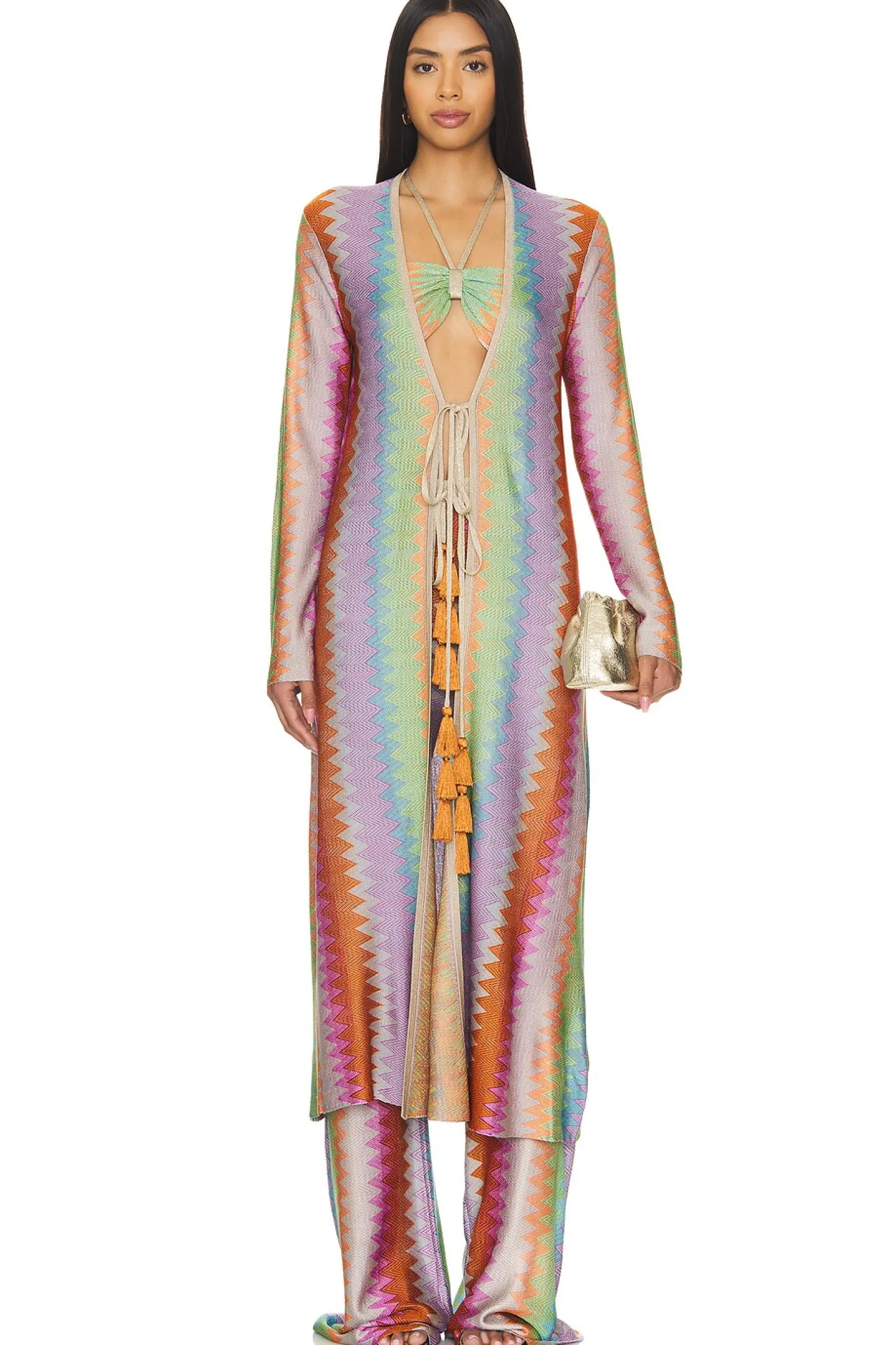 100% viscose.Made in China.Dry clean.Front tie closure