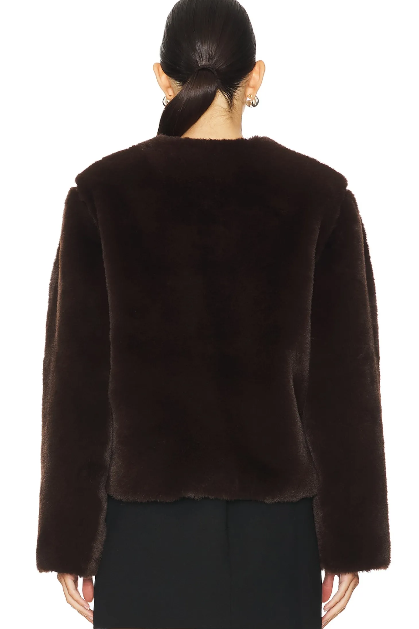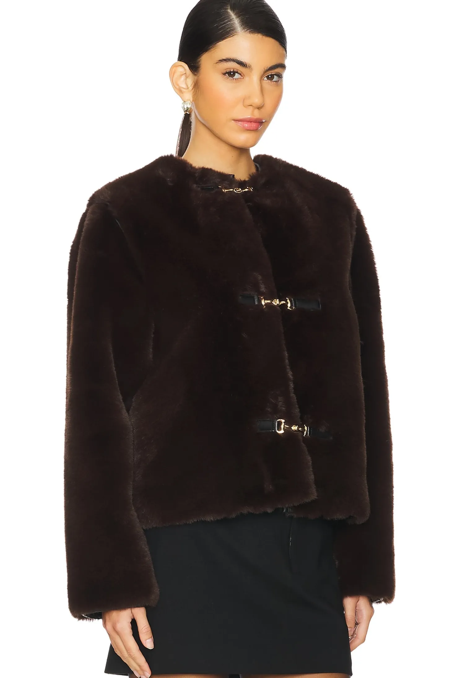 Self: Faux Fur: 100% polyester Lining: 100% polyester.Made in China.Dry clean only.Gold-tone hardware with twist lock closure.Side seam pockets.Faux fur exterior