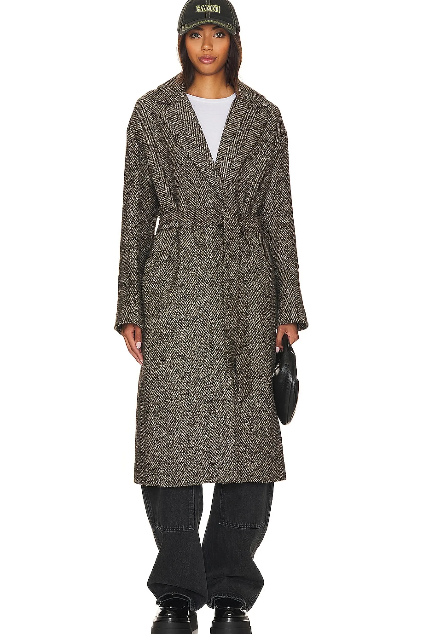 100% polyester.Made in China.Dry clean only.Open front styling.Detachable herringbone waist belt.Side seam pockets.Button cuffs.Printed herringbone fabric with back vent