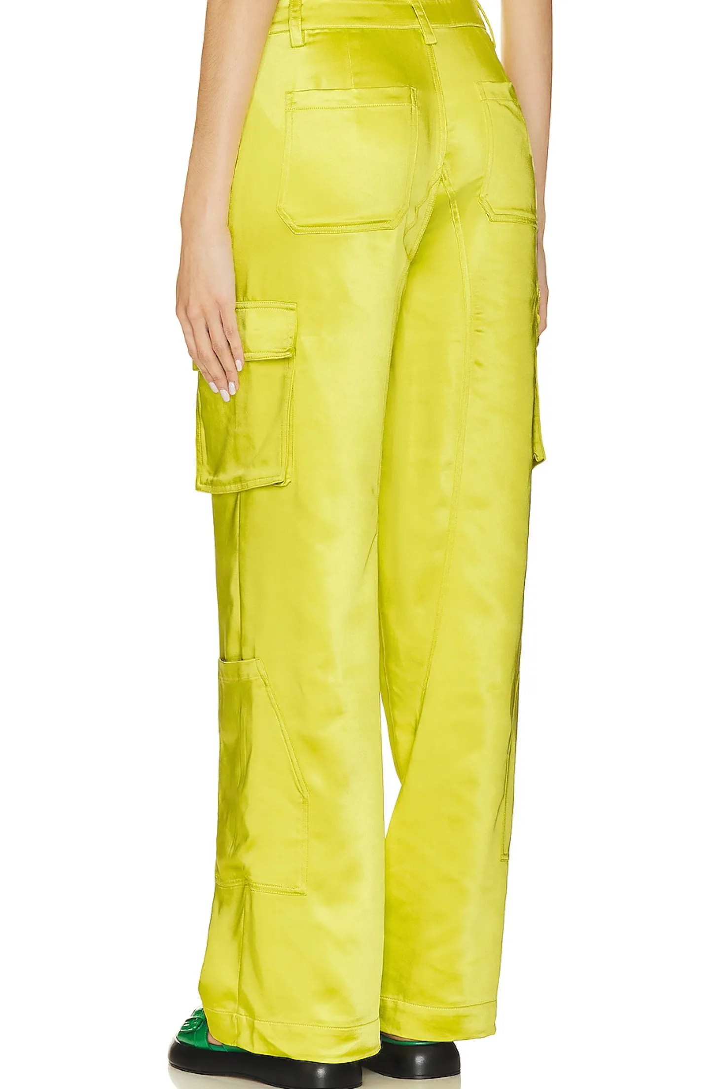 100% polyester.Made in China.Machine wash.Zip fly with button closure.4-pocket styling with side cargo and slip pockets.Lightweight satin fabric.20" at the knee and 20" at the leg opening