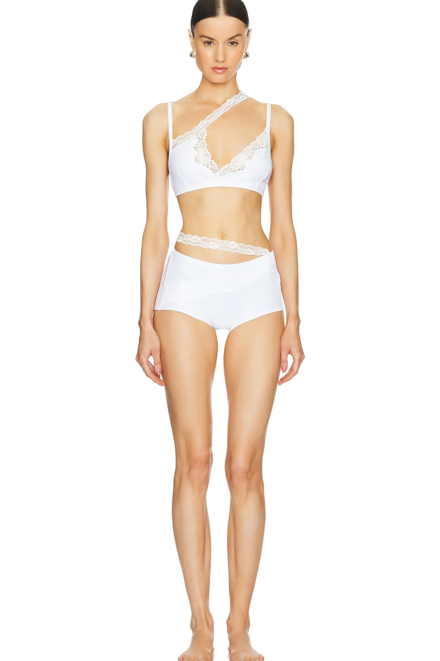 95% cotton 5% elastane.Made in Poland.Machine wash.Unpadded.Back hook and eye closure.Asymmetric lace strap with S-hook closure