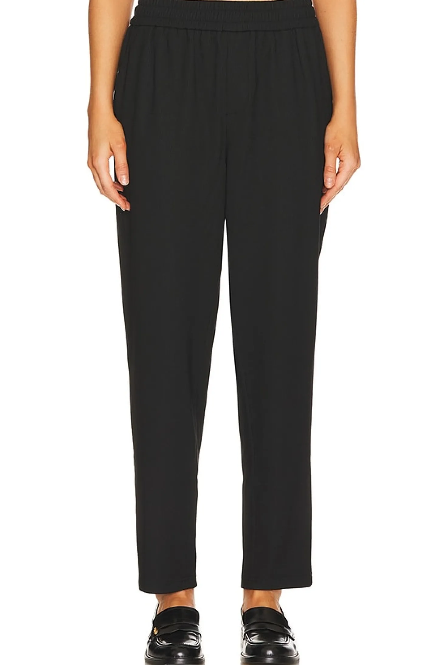 81% polyester 13% rayon 6% spandex.Made in China.Machine wash.Elastic waistband with interior drawstring tie closure.3-pocket styling.19" at the knee narrows to 14" at the leg opening
