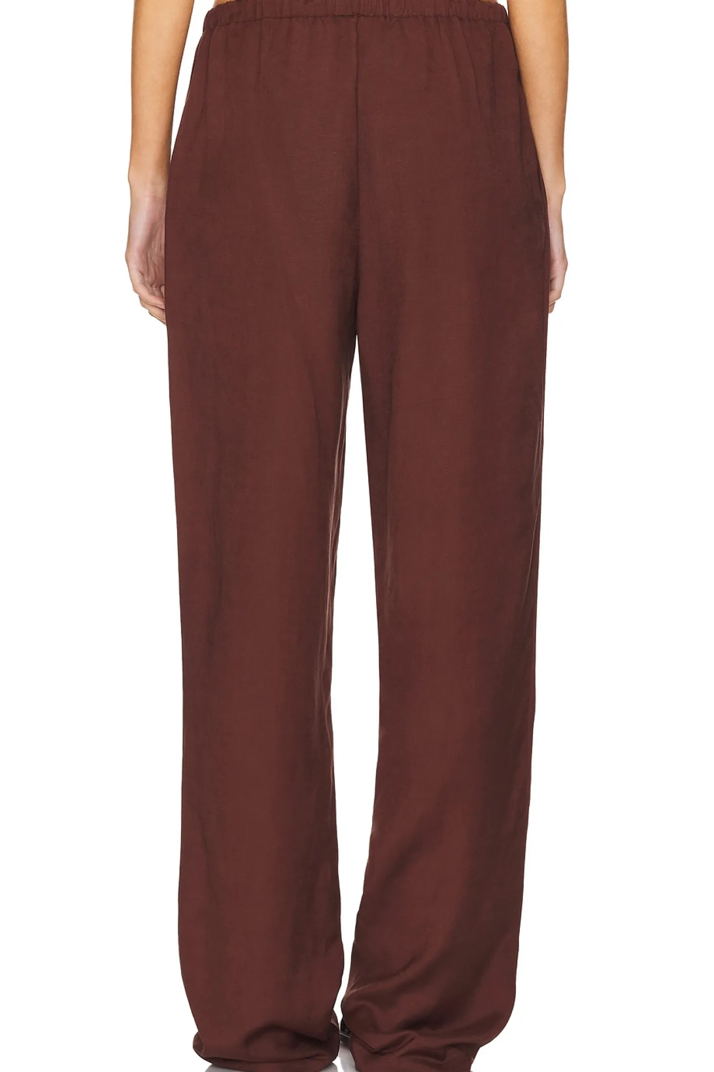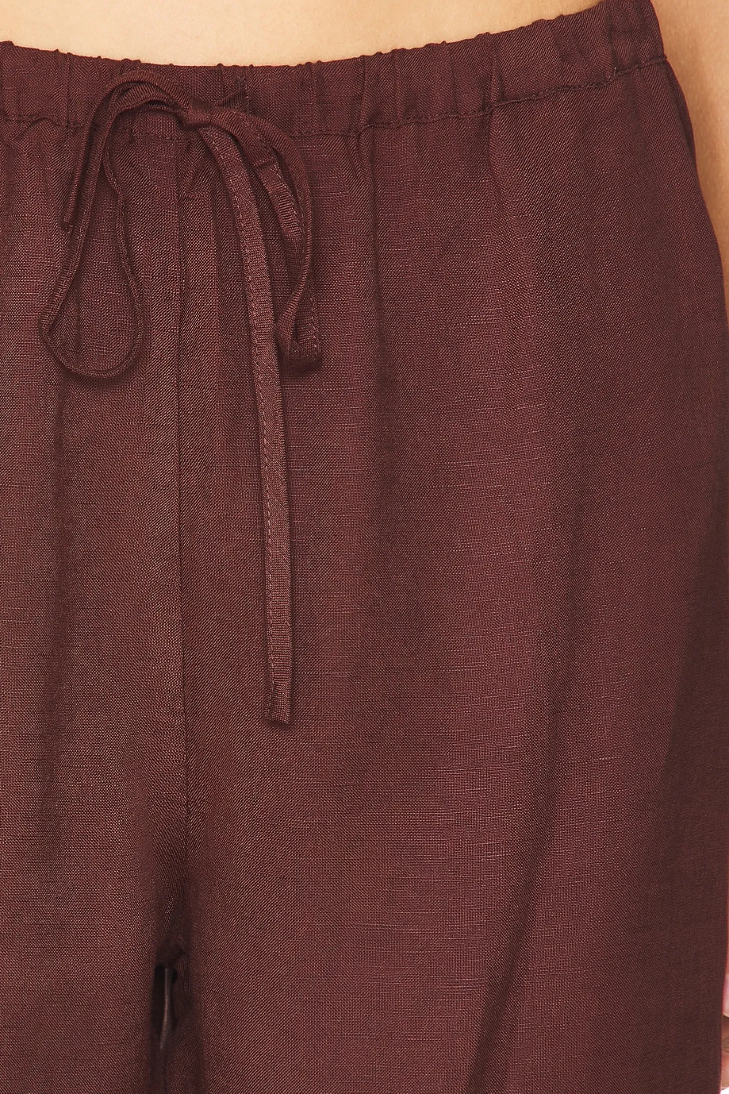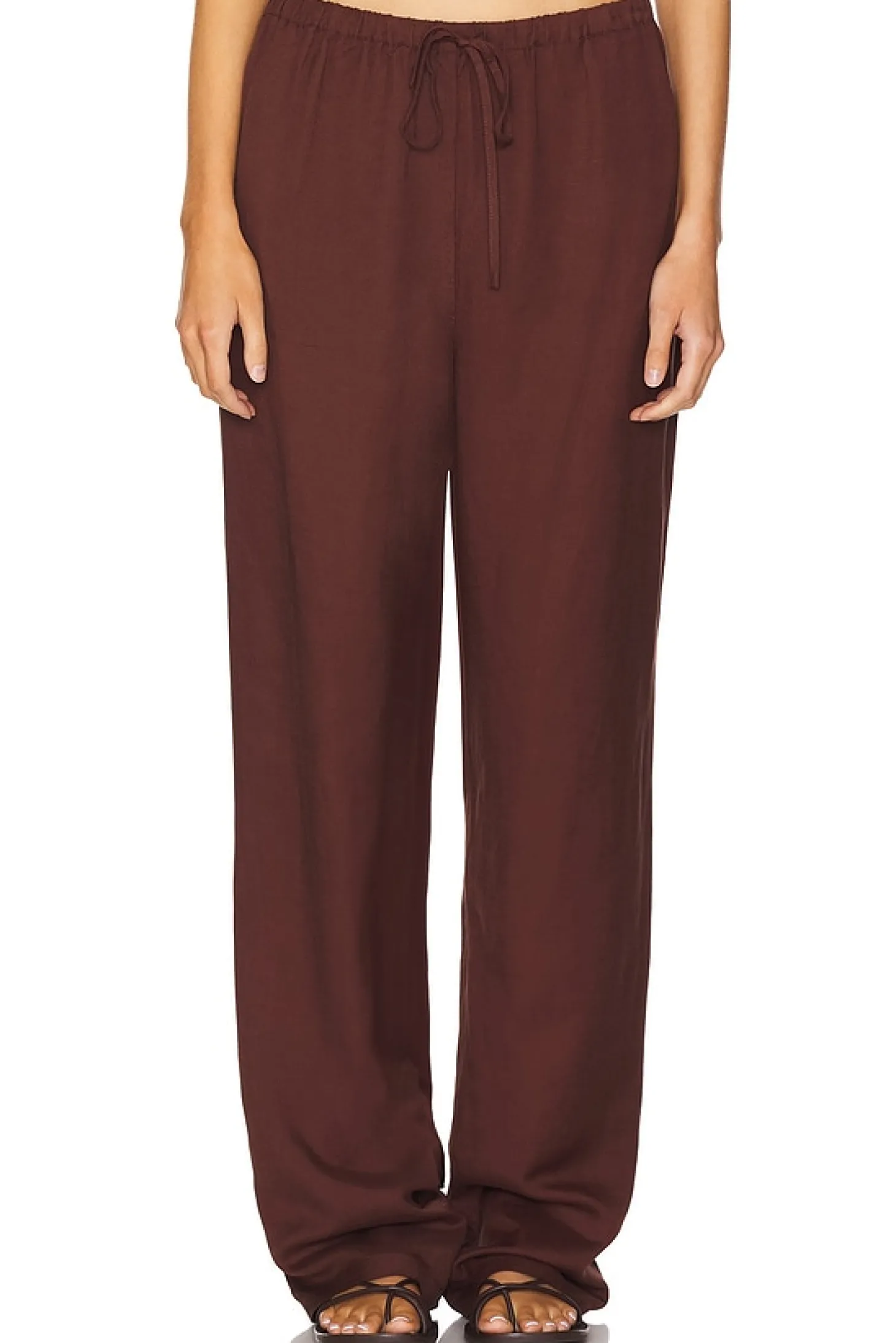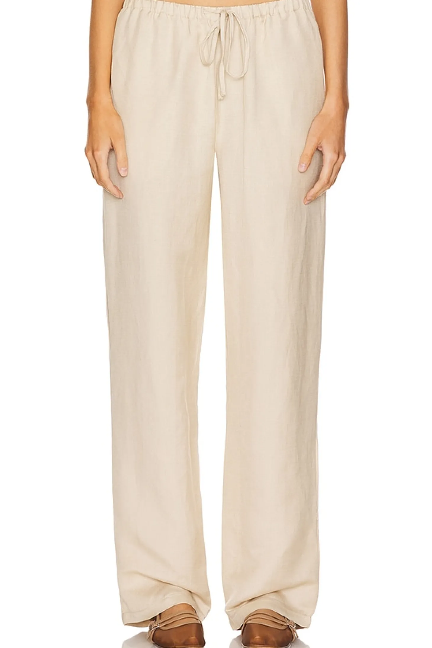 55% linen 45% viscose.Made in China.Hand wash.Elastic waistband and drawstring.Side seam pockets.Linen fabric.Item not sold as set.22" at the knee narrows to 19" at the leg opening