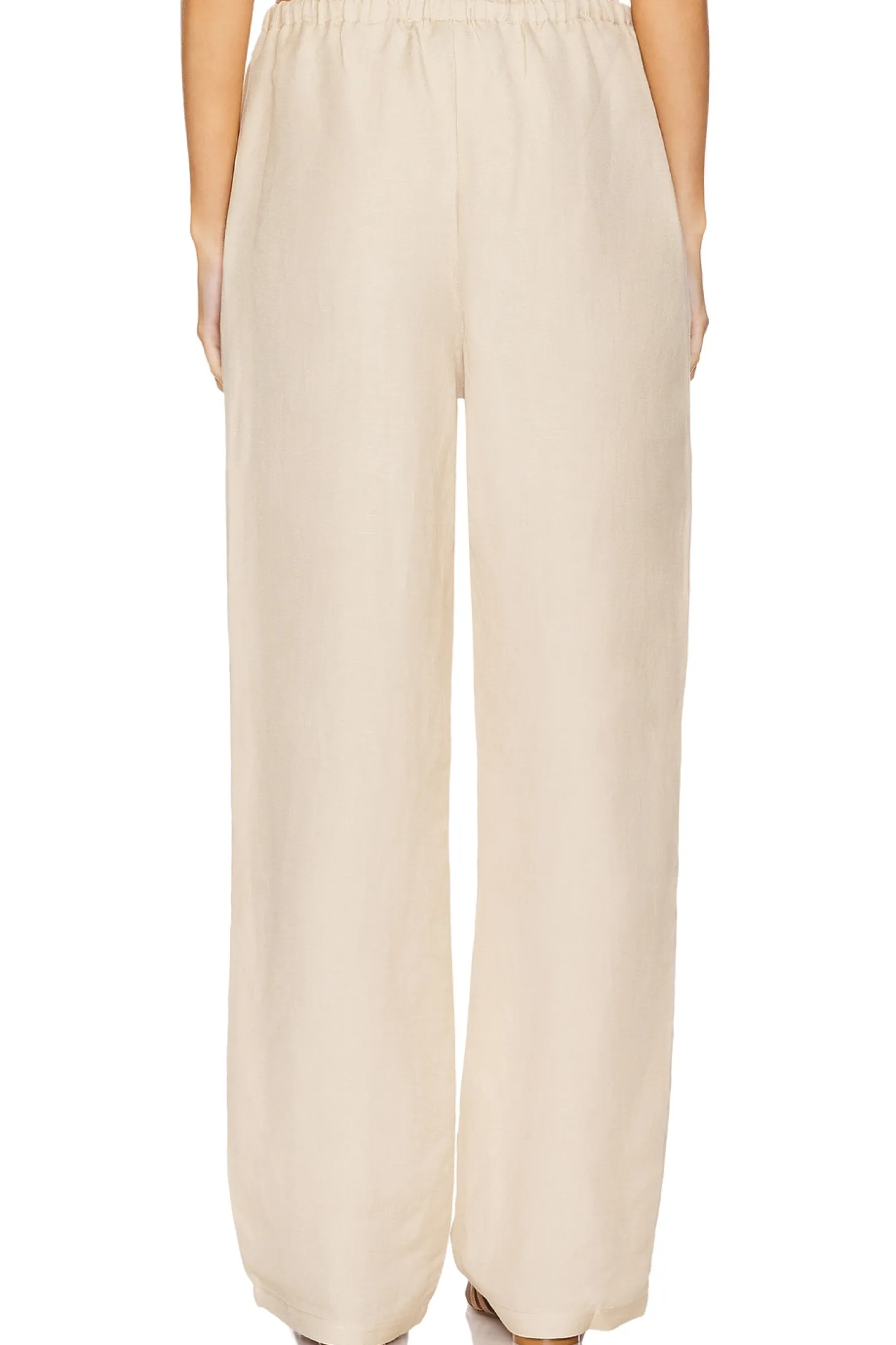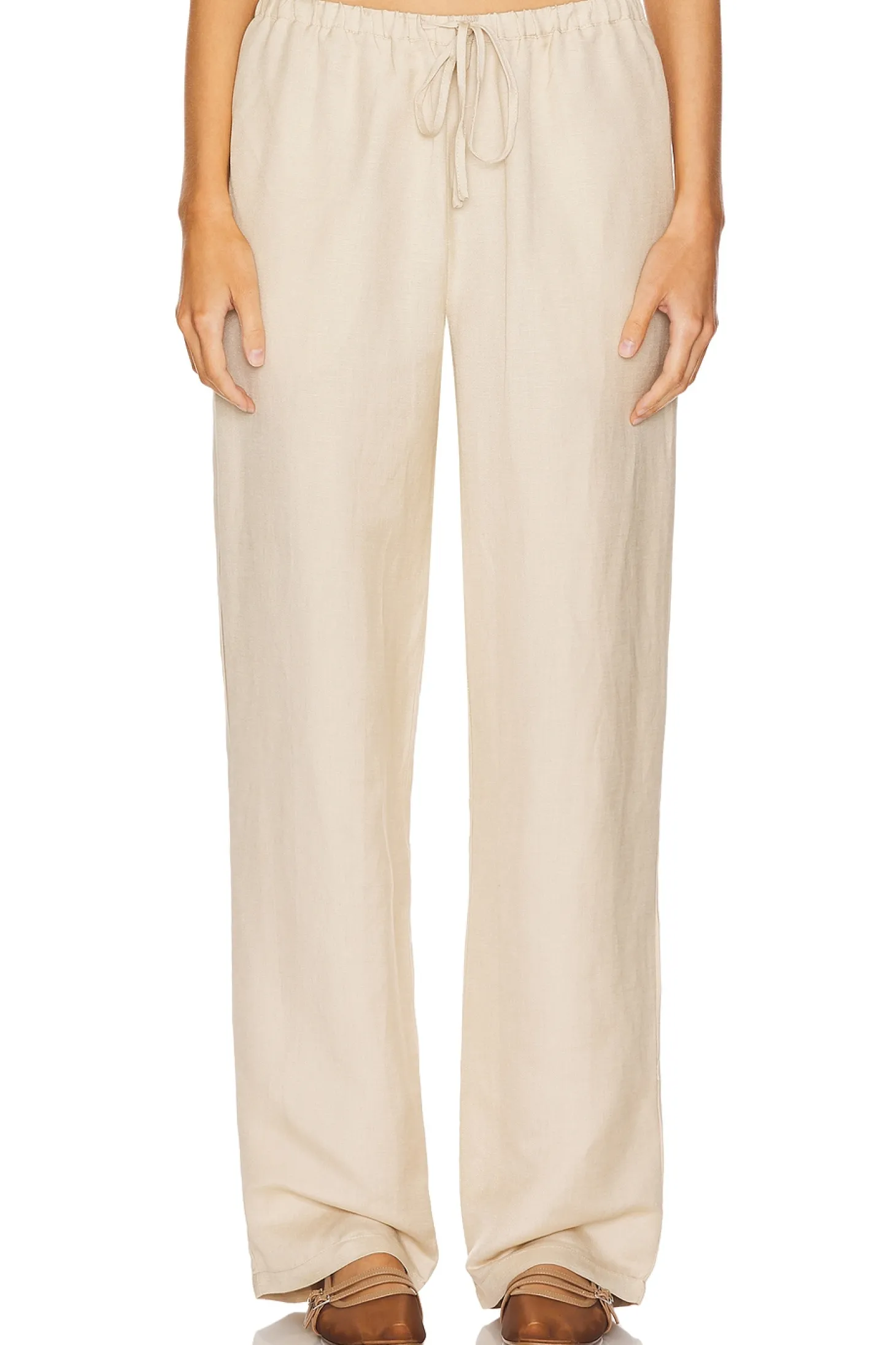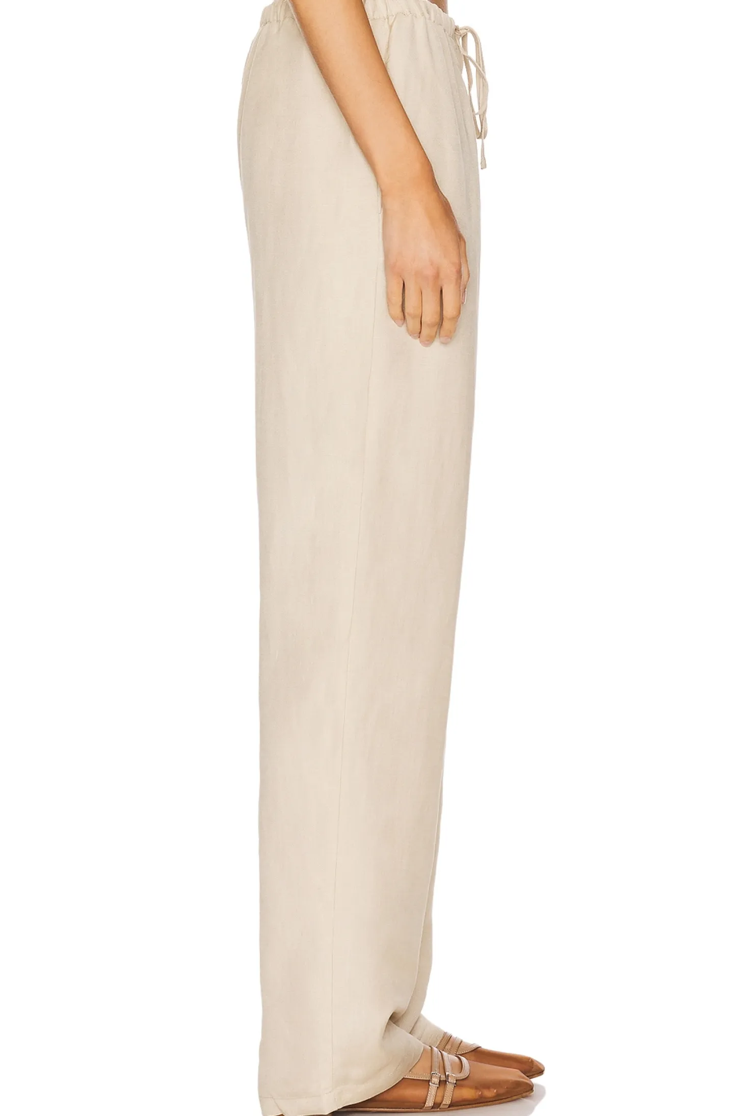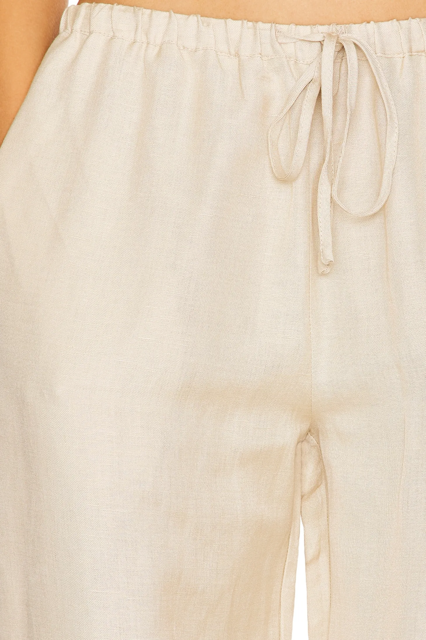 55% linen 45% viscose.Made in China.Hand wash.Elastic waistband and drawstring.Side seam pockets.Linen fabric.Item not sold as set.22" at the knee narrows to 19" at the leg opening