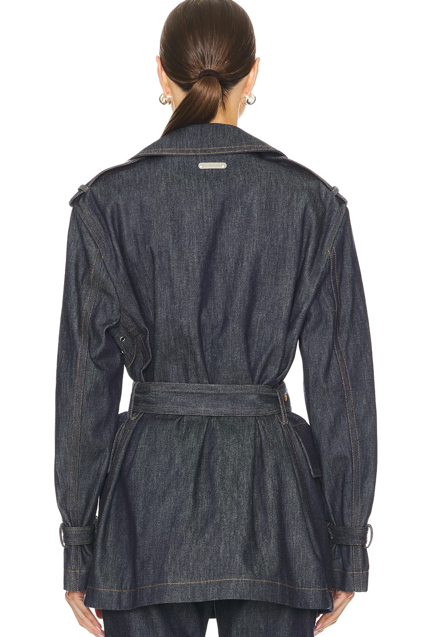 Self: 100% cotton Self 2: 65% polyester 35% cotton.Made in China.Dry clean only.Front button closure with optional belt.4-pocket design
