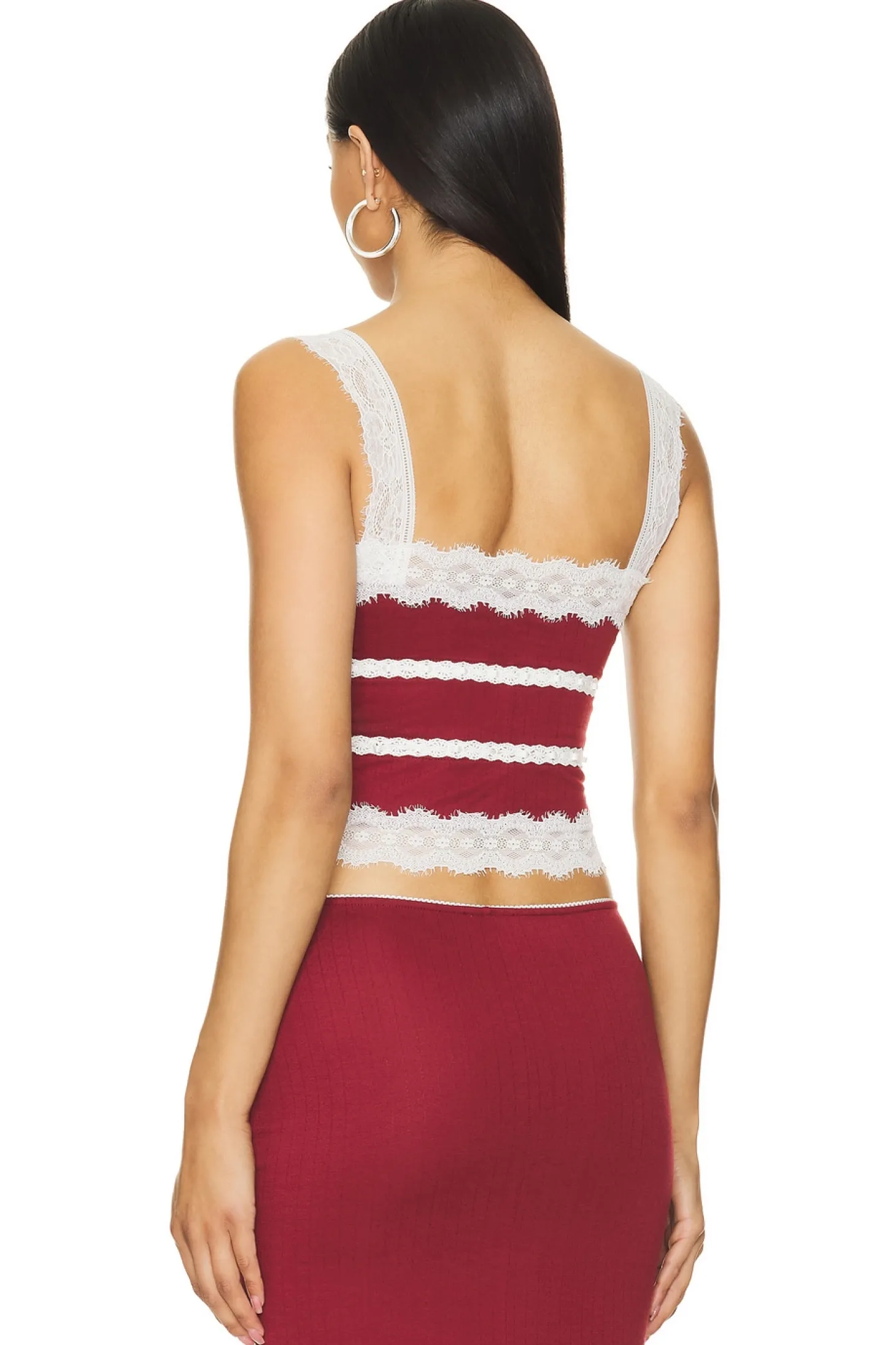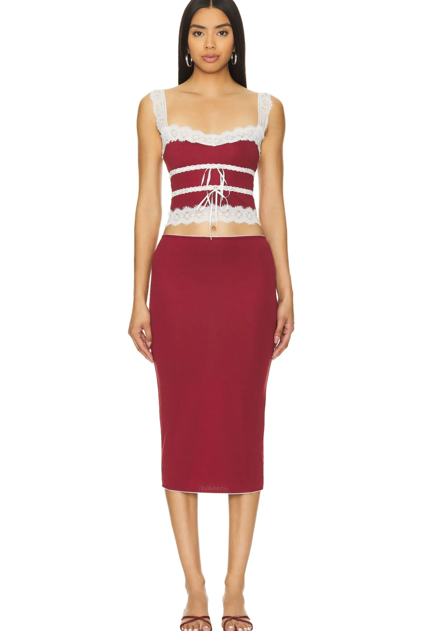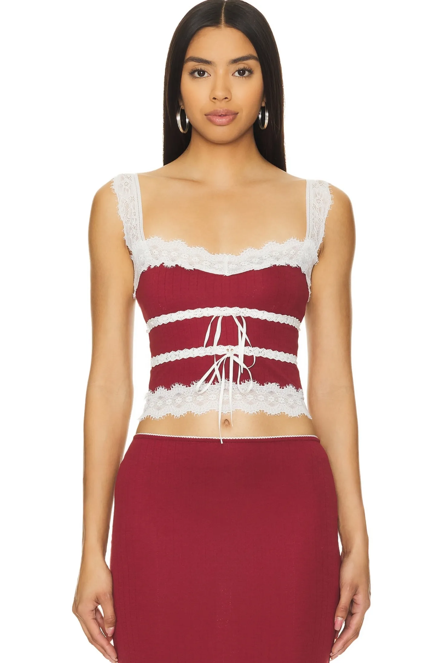 62% polyester 30% rayon 8% elastane.Made in China.Hand wash.Front tie detail.Lace trim.Lightweight pointelle fabric.Item not sold as a set