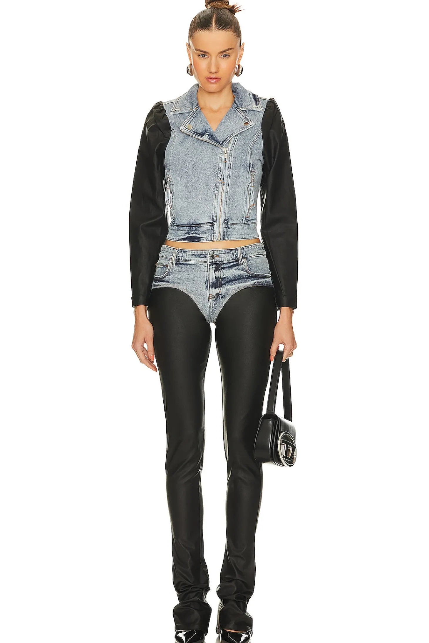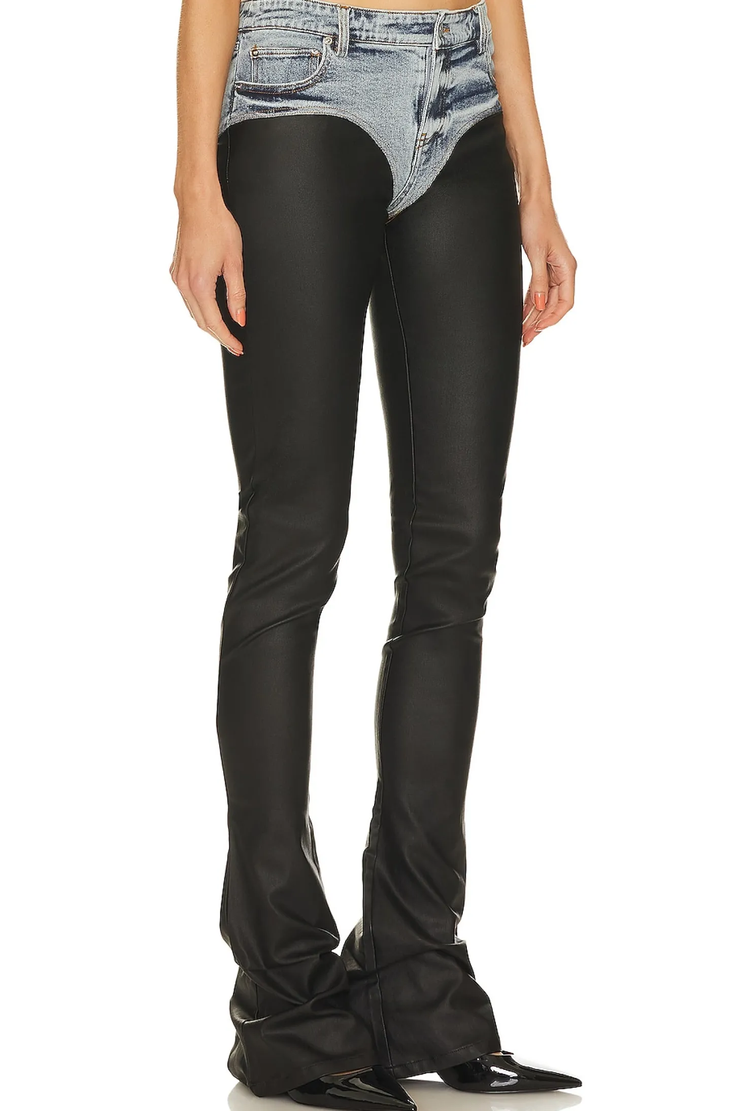 Self: 99% cotton 1% spandex Legs: 80% rayon 15% nylon 5% spandex.Made in China.Hand wash.Zip fly with button closure.5-pocket styling.Coated denim panels.Item not sold as a set.14" at the knee breaks to 18" at the leg opening