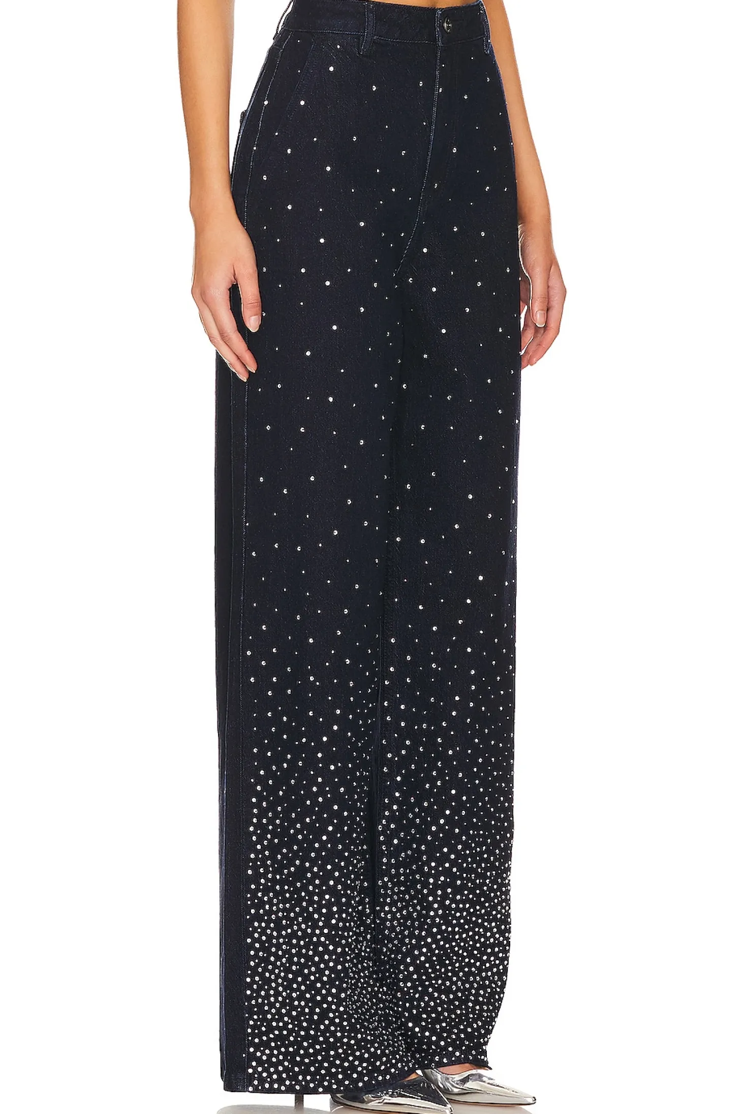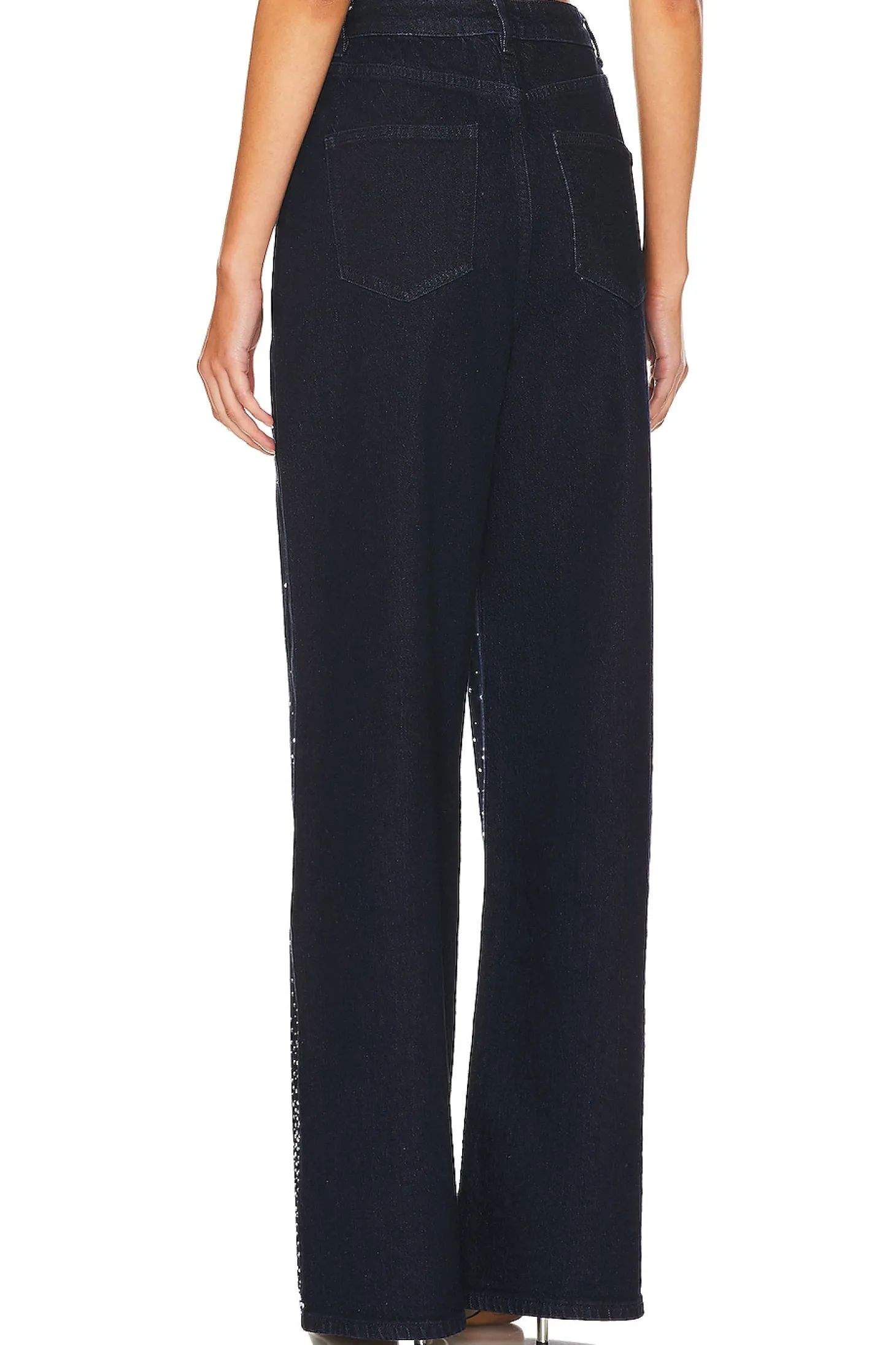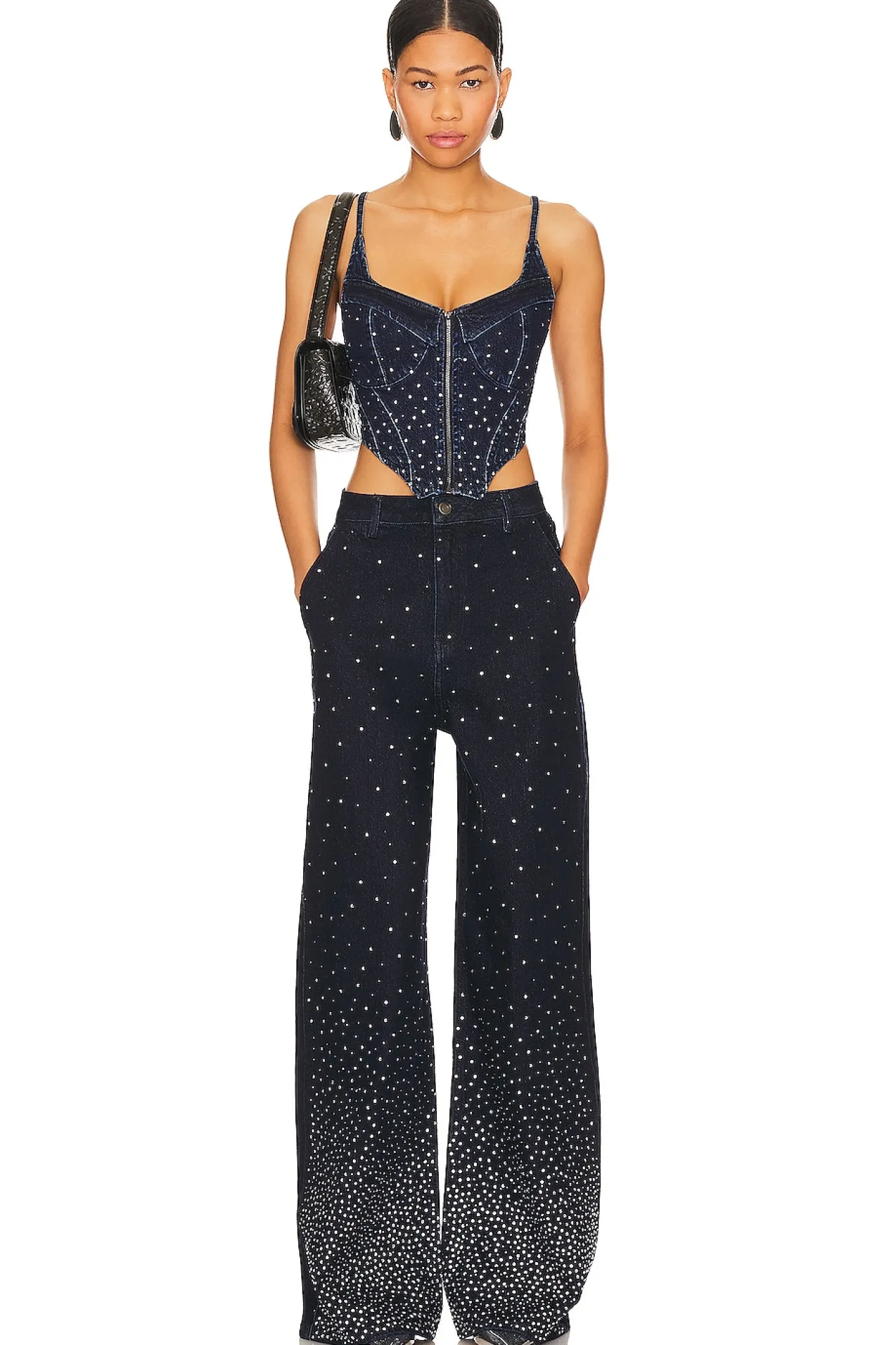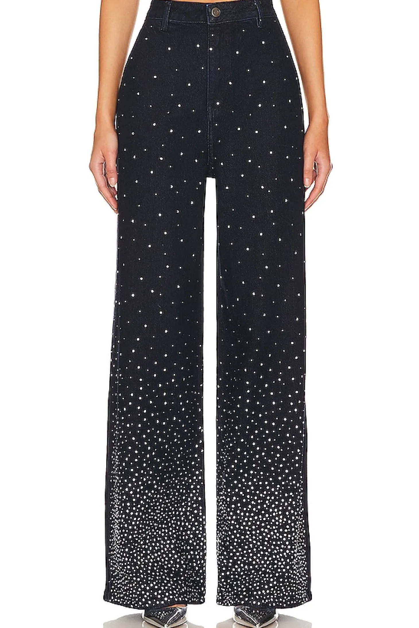 99% cotton 1% spandex.Made in China.Hand wash.Zip fly with button closure.4-pocket styling.Rigid denim with heat-stamped crystals.21" at the knee breaks to 24" at the leg opening