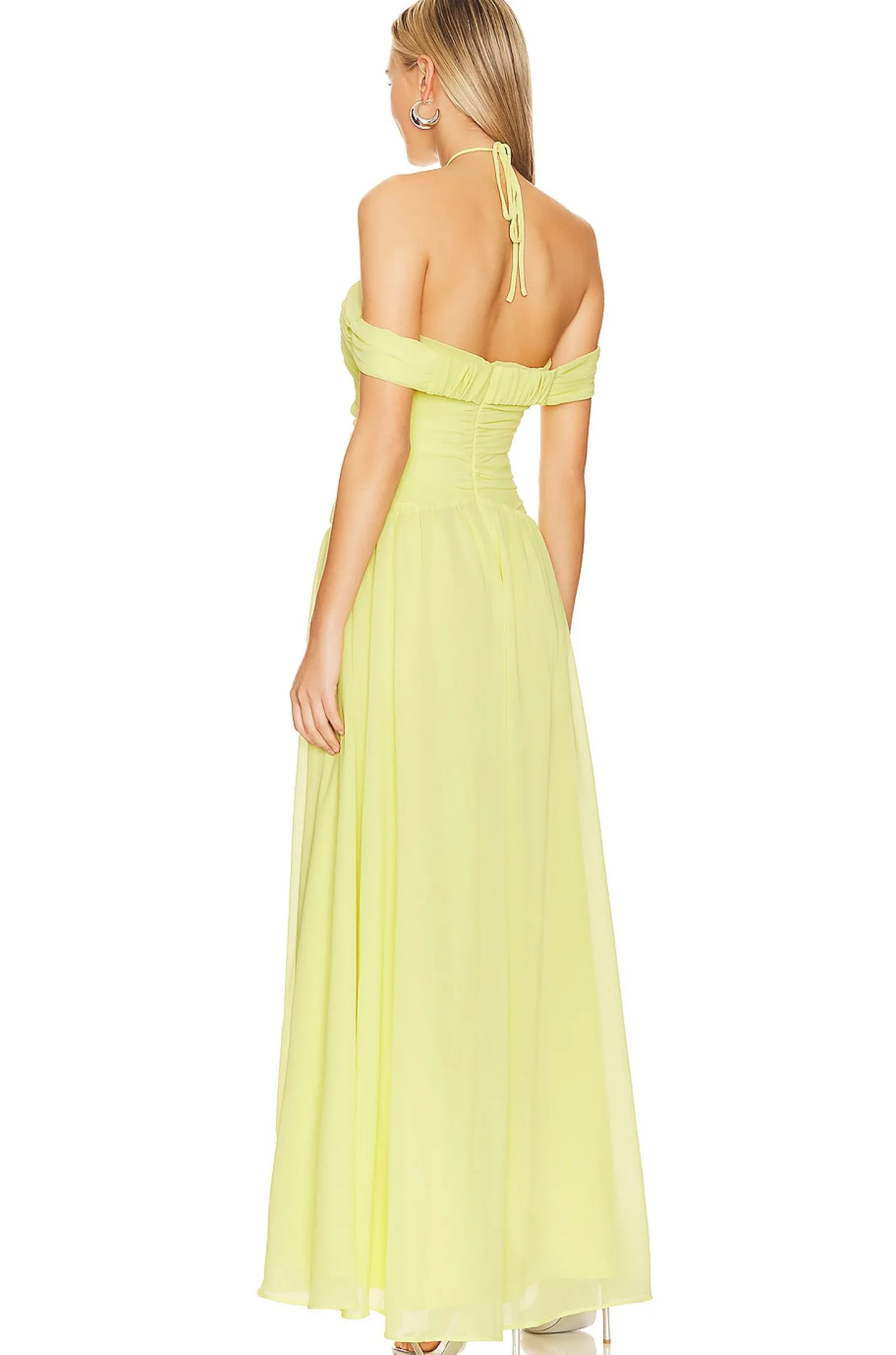 100% polyester.Made in China.Dry clean only.Fully lined.Hidden back zipper closure Halterneck tie closure with V-wire center.Draped off shoulder design Cut-out bust detail.Lightweight crepe fabric overlay with hi-low hem