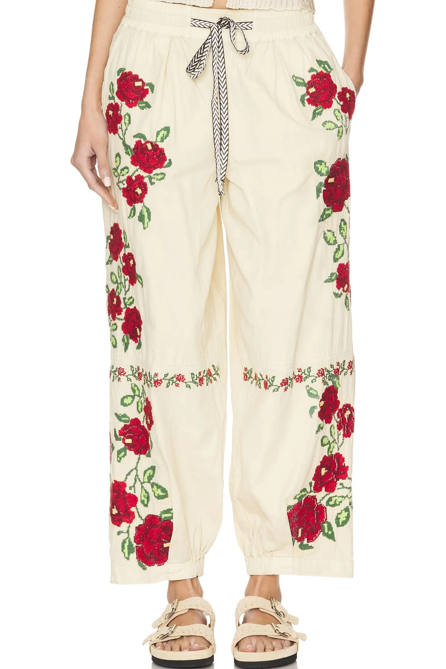 Self: 91% cotton 9% linen Embroidery: 100% polyester.Made in India.Machine wash.Elastic drawstring waist tie.4-pocket styling.Linen fabric with embroidered roses.24" at the knee narrows to 18" at the leg opening